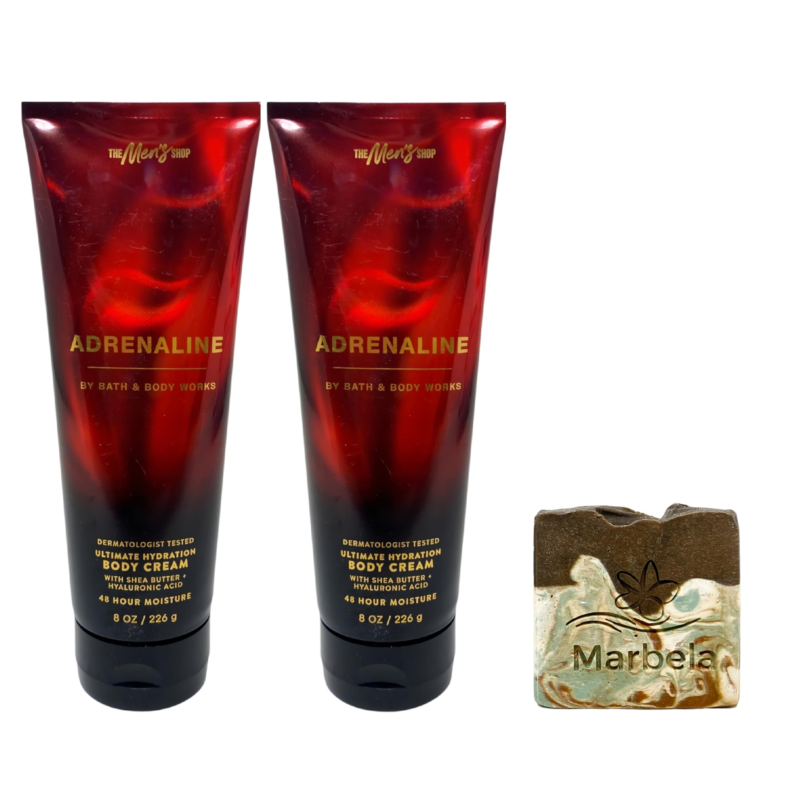 Marbela Cabin Spice Bar Soap: Imagine being cozied up next to a bonfire, cooking over the fire, and smelling the smoke all through the air. There are few things that feel quite like fall in the same way a bonfire does. Cabin Spice is the perfect warm scent to last from early fall all the way through the winter. Notes of: Tobacco, Patchouli, Bay. Woodsy and bright, it's like the fresh burst of energy after giving it your all. Fragrance notes: bergamot, rich oud and sweet sandalwood. INCLUDES: 8 oz 226 g Each Body Creams - What it does: hydrates intensely to relieve dry skin now moisturizing for up to 48 hours. Bath Body Works Adrenaline Ul timate Hydration Body Creams with a 4 oz Marbela Cabin Spice Soap (Soap May Vary).