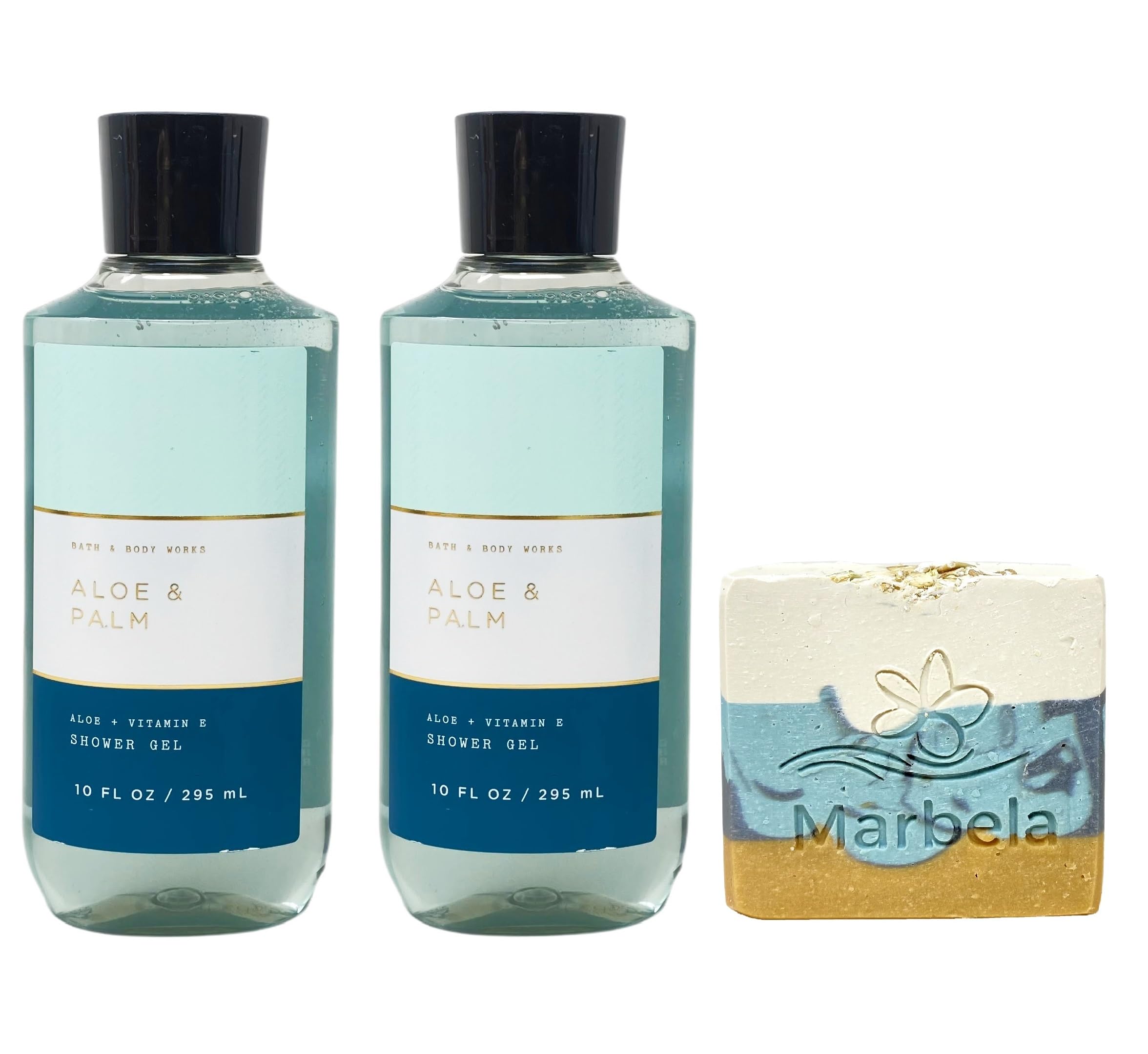 Bath Body Works Aloe Palm 2 Pack Shower Gel with a Marbela Sea Breeze Bar Soap (Ingredients: Saponified Oils of: Olive Oil, Organic Virgin Coconut Oil, Shea Butter, Cocoa Butter, Vitamin E, Oats, Fragrance, Mica).