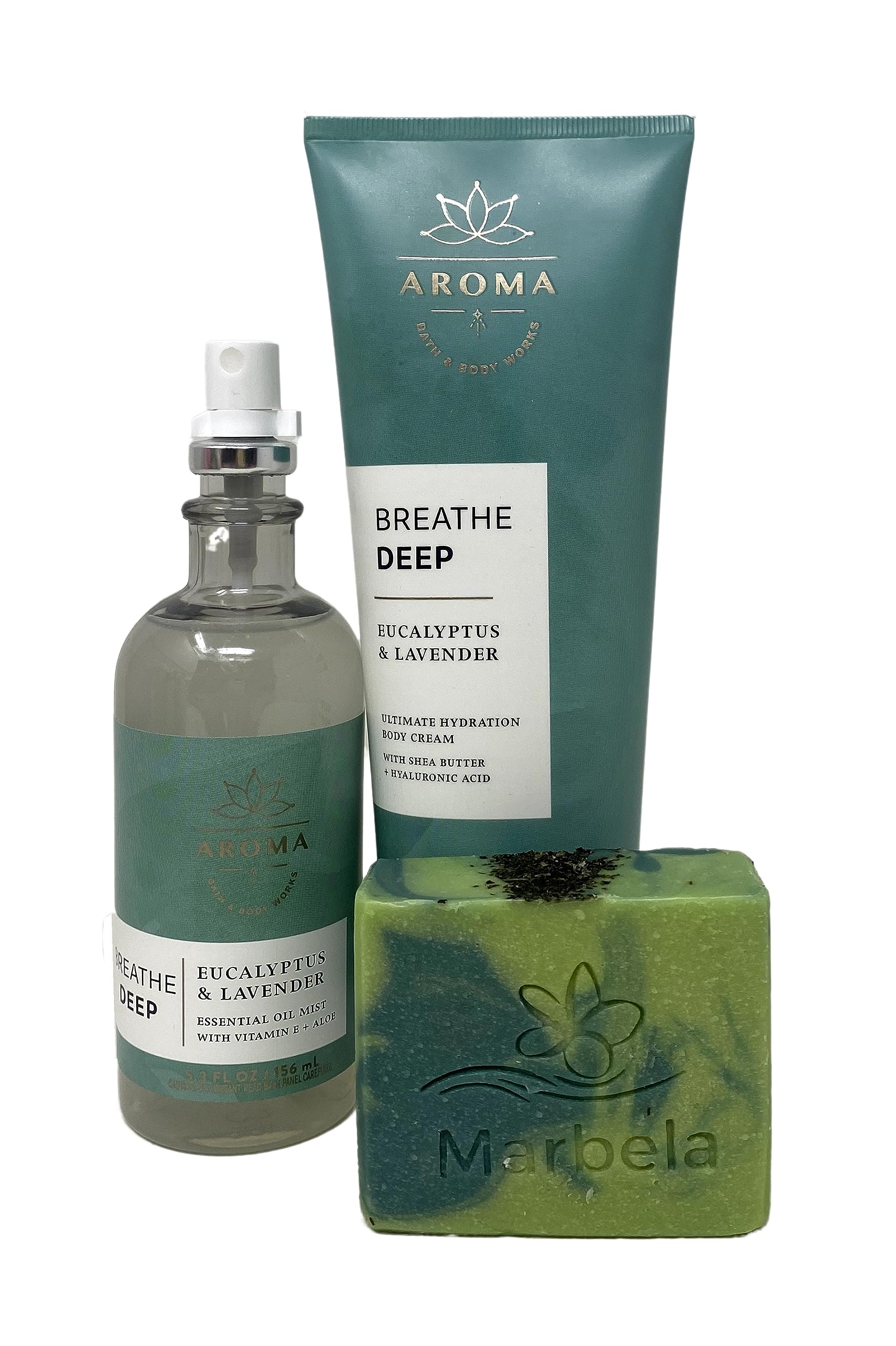 Bath & Body Works Aroma Breathe Deep Eucalyptus & Lavender Gift Set- Ultimate Hydration Body Cream - Essential Oil Mist with a Fresh Forest Bar Soap.