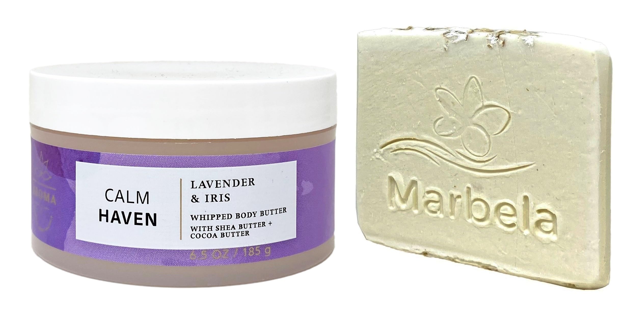 Marbela Sample Soap - While ordinary soaps dry out your skin, Marbela specializes in all-natural, moisturizing soaps and bath products that will take your self-care routine to the next level. The priority is to create products that are all-natural, vegan, cruelty-free and most importantly, handmade with love. Calm Haven - What it smells like: a floral calm haven for relaxation and reflection. Fragrance notes: lavender essential oil and iris extract. Whipped Body Butter 6.5 oz 185 g .- What it does: provides over 24 hours of intense moisture. Bath Body Works Aroma Calm Heaven Lavender Iris with a Marbela Natural Oats Sample Soap.