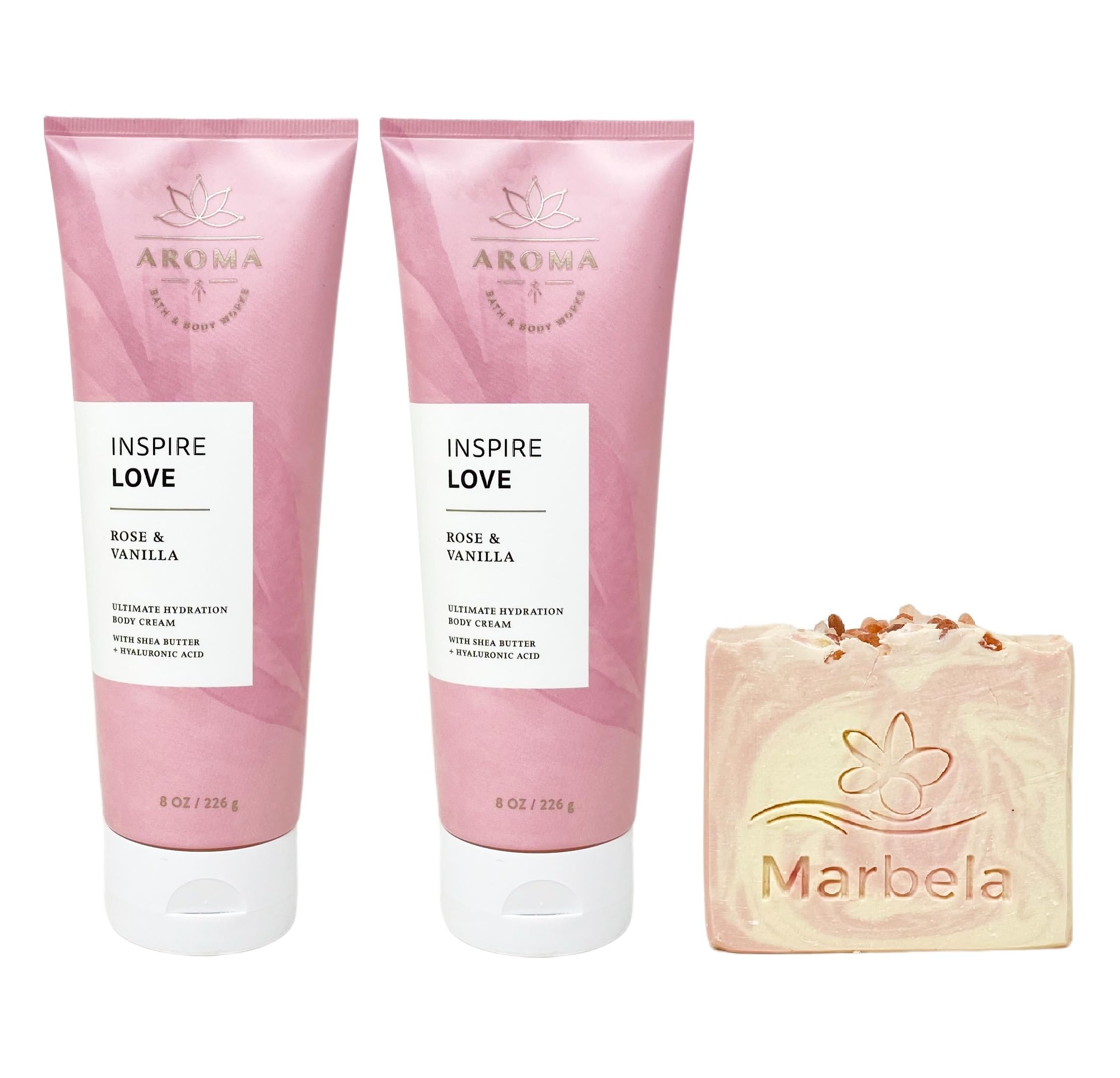 Marbela Himalayan Salts Springs Soap - Himalayan salts help hydrate and nourish the skin, with its water absorbent properties. These minerals are known to be helpful for acne, irritated and dry skin. Himalayan Salt Springs soap has natural kaolin clay blended to further moisturize and hydrate your body. Scent: Citrusy Florals with Litsea Cubeba Essential Oil. Rose Vanilla - What it smells like: a sweet, smooth floral created to inspire all the love. Fragrance notes: rose essential oil and vanilla absolute. 2 Ultimate Hydration Body Creams (8 oz 226 g each) - What it does: provides intense hydration to relieve dry skin for 24-hour moisture. Infused with the good stuff (natural essential oils, vitamin E, aloe, shea and cocoa butters and hyaluronic acid). Bath Body Works Aroma Inspire Love ROSE VANILLA Body Cream Set with a 4 oz Marbela Himalayan Salts Springs Bar Soap. ( Soap May Vary).