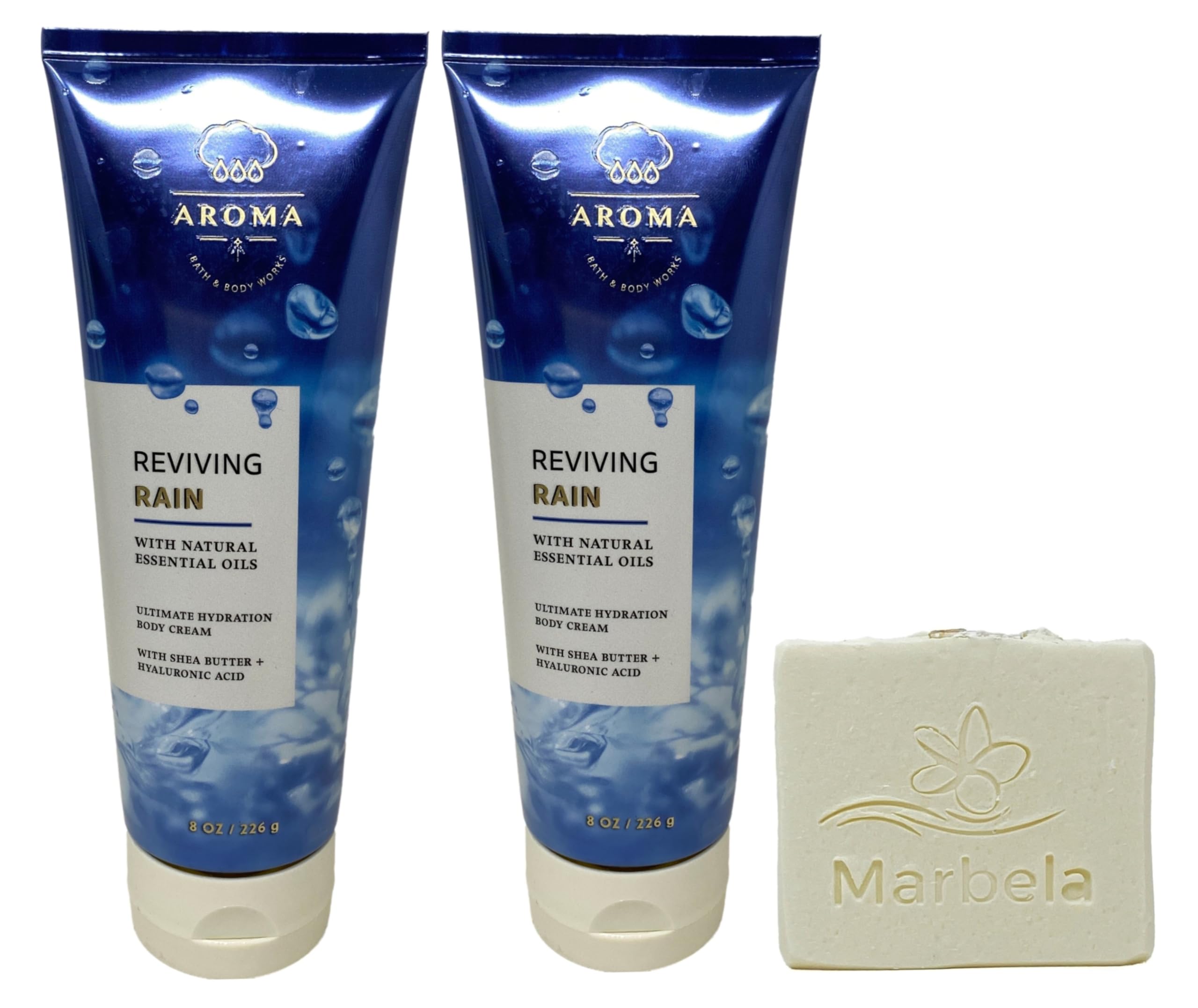 Bath Body Works Aroma Reviving Rain 2 Pack Ultimate Hydration Body Cream Bundle with a Marbela Natural Oats Bar Soap