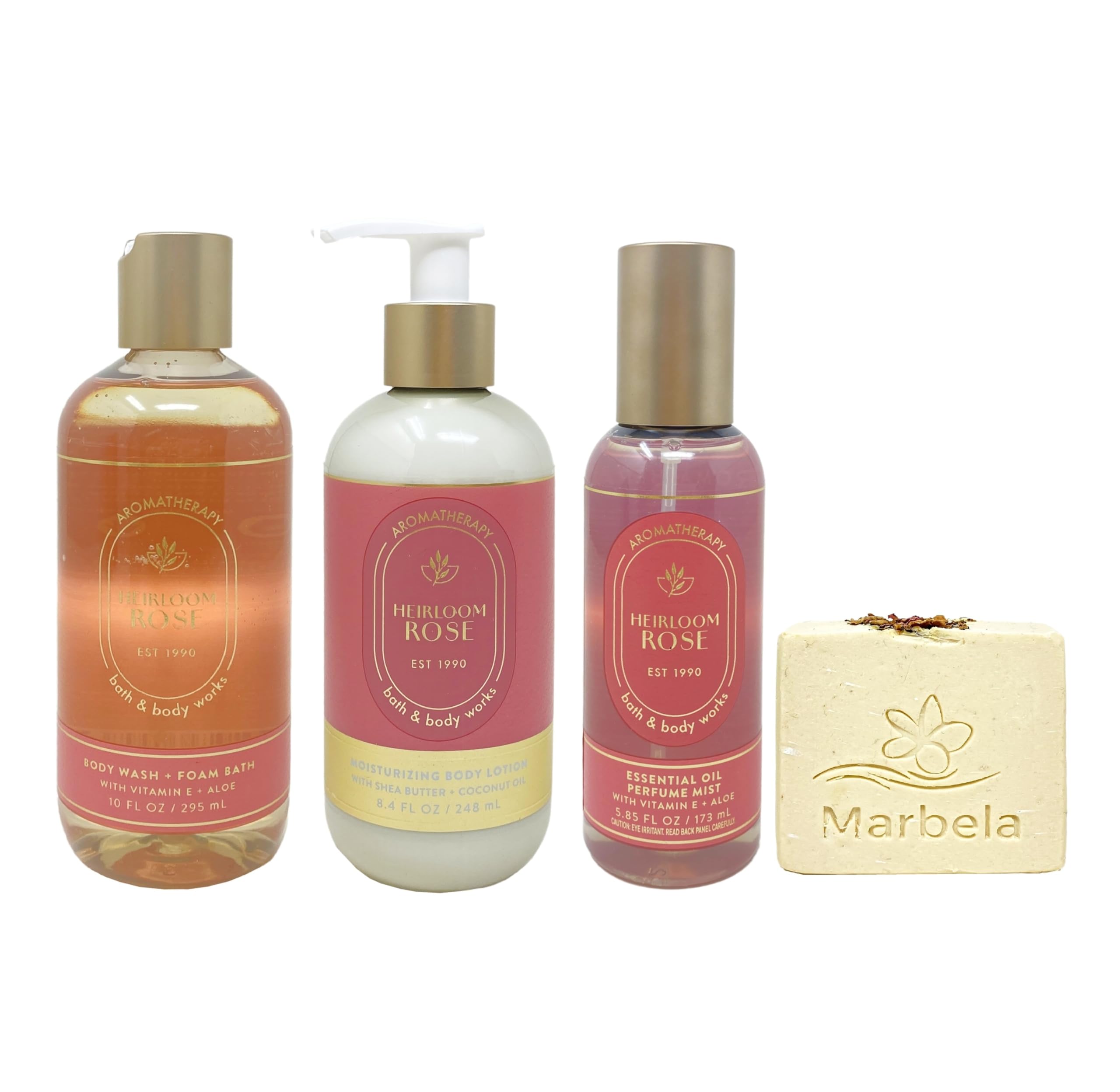 Bath Body Works Aromatherapy Heirloom Rose - Body Wash Foam Bath - Mosturizing Body Lotion and Essential Oil Perfume Mist - with a Creamy Rose Bar Soap ( Ingredients: Saponified Oils of: Olive Oil, Organic Virgin Coconut Oil, Shea Butter, Castor Oil, Vitamin E, Oats, Rose Petals, Mica, Fragrance, Ylang Ylang Essential Oil, Titanium Dioxide).