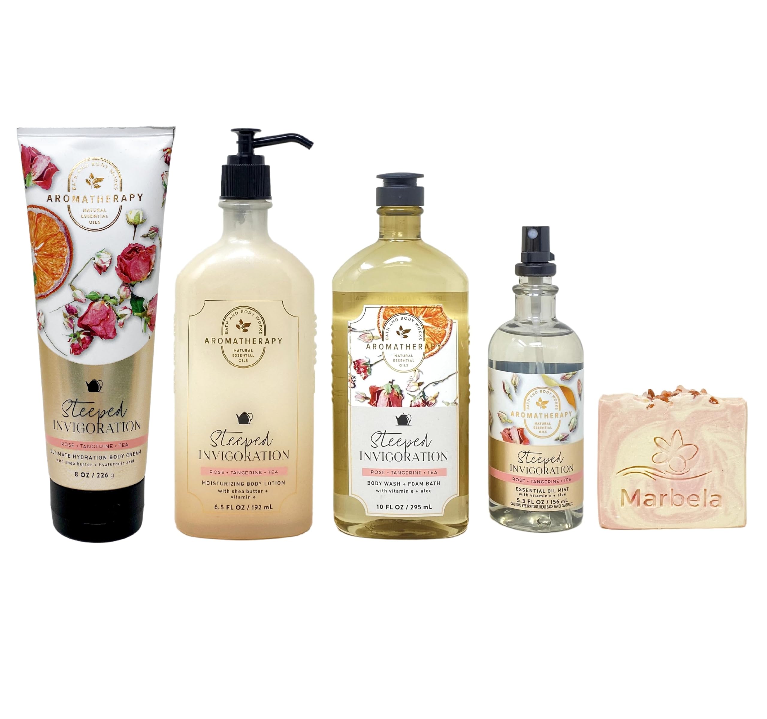 Bath Body Works Aromatherapy Steeped Invigoration Rose Tangerine Tea Deluxe Set with a 4 oz Marbela Himalayan Salts Springs Bar Soap. (Ingredients: Saponified Oils of: Olive Oil, Organic Virgin Coconut Oil, Shea Butter, Castor Oil, Himalayan Salts, Kaolin Clay, Fragrance, Vitamin E, Mica, Litsea Cubeba Essential Oil).