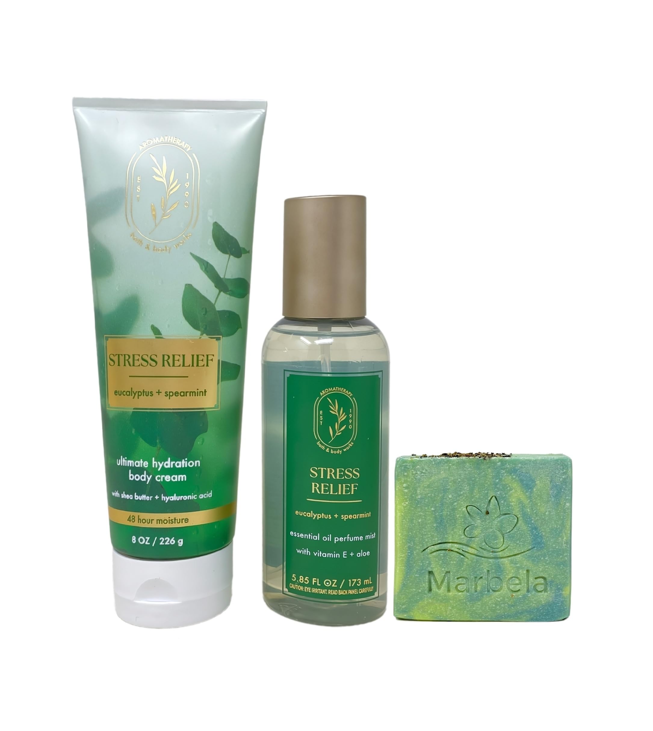 Bath Body Works Aromatherapy Stress Relief Eucalyptus Spearmint - Ultimate Hydration Body Cream And Essential Oil Perfume Mist - with a Fresh Forest Bar Soap (Saponified Oils of: Olive Oil, Organic Virgin Coconut Oil, Shea Butter, Castor Oil, Dried Mint, Mica, Fragrance, Sodium Lactate, Vitamin E, Rosemary Essential Oil).