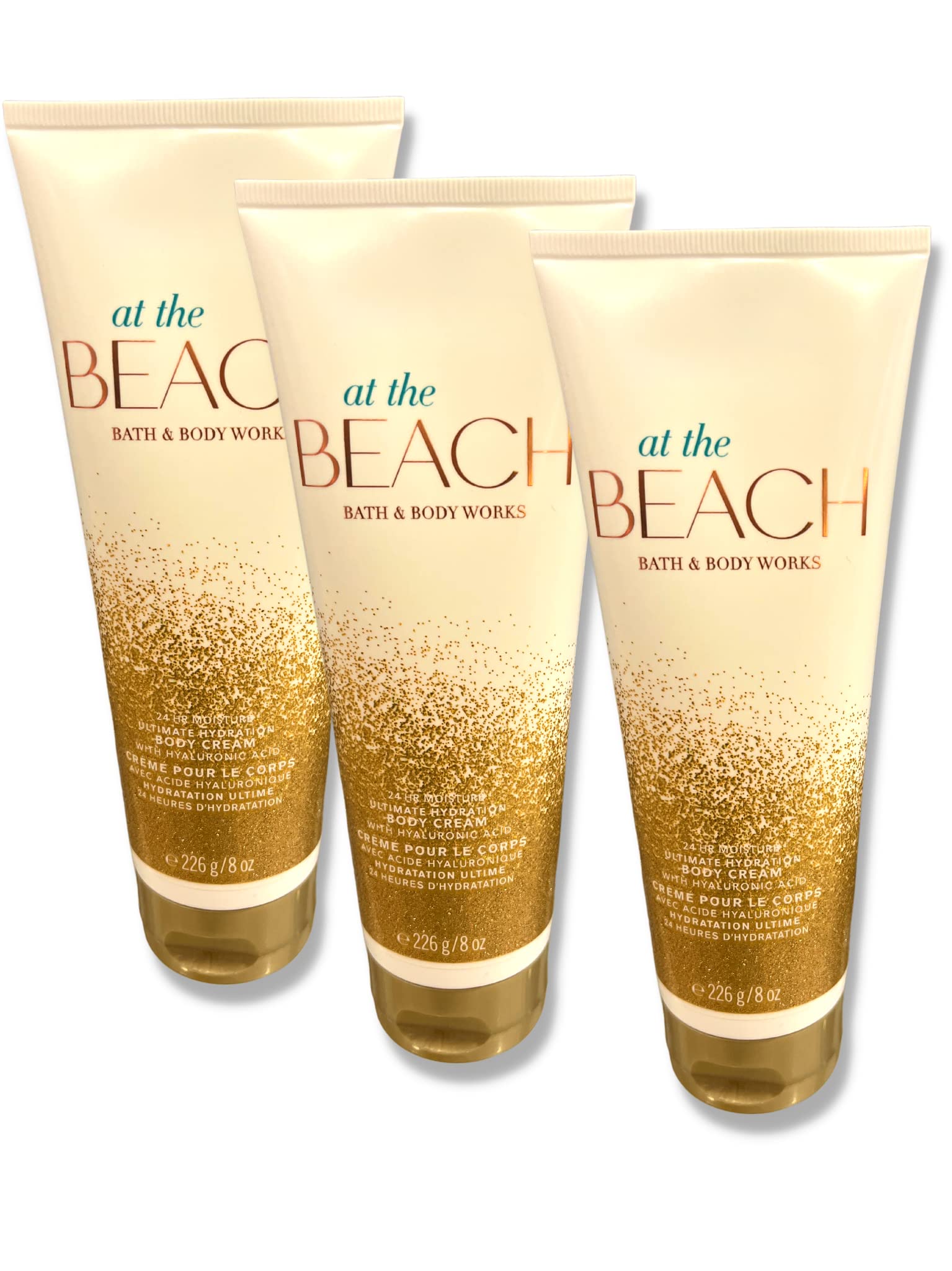 Bath and Body Works (Packaging May Vary) At the Beach Body Cream 3-pack. 8 Oz. each tube 24 Oz. total in set. Scent: frangipani blossoms, toasted coconut and bergamot waters. Some ingredients: vitamin E, aloe, shea and cocoa butters and hyaluronic acid.