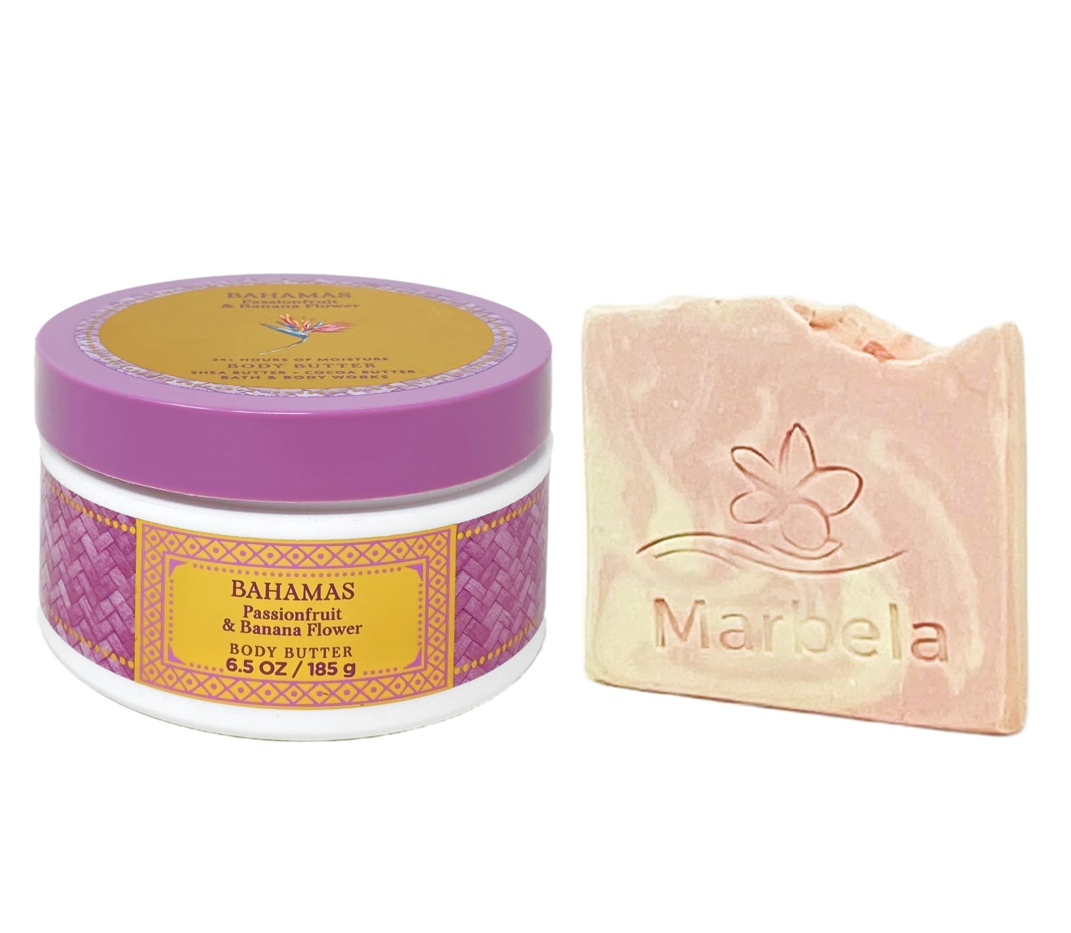 Bath Body Works Bahamas Passionfruit Banana Flower Body Butter with a Marbela Himalayan Salts Spring Sample Soap (Ingredients: Saponified Oils of: Olive Oil, Organic Virgin Coconut Oil, Shea Butter, Castor Oil, Himalayan Salts, Kaolin Clay, Fragrance, Vitamin E, Mica, Litsea Cubeba Essential Oil, Titanium Dioxide, Sodium Lactate).