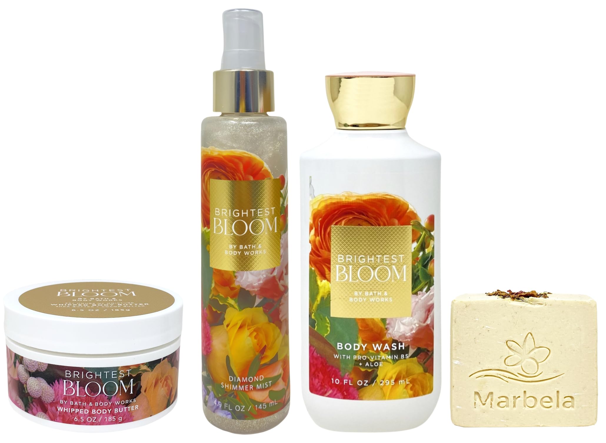 Bath Body Works Brightest Bloom Body Wash, Whipped Body Butter and Diamond Shimmer Mist with a Creamy Rose Bar Soap ( Ingredients: Saponified Oils of: Olive Oil, Organic Virgin Coconut Oil, Shea Butter, Castor Oil, Vitamin E, Oats, Rose Petals, Mica, Fragrance, Ylang Ylang Essential Oil, Titanium Dioxide).