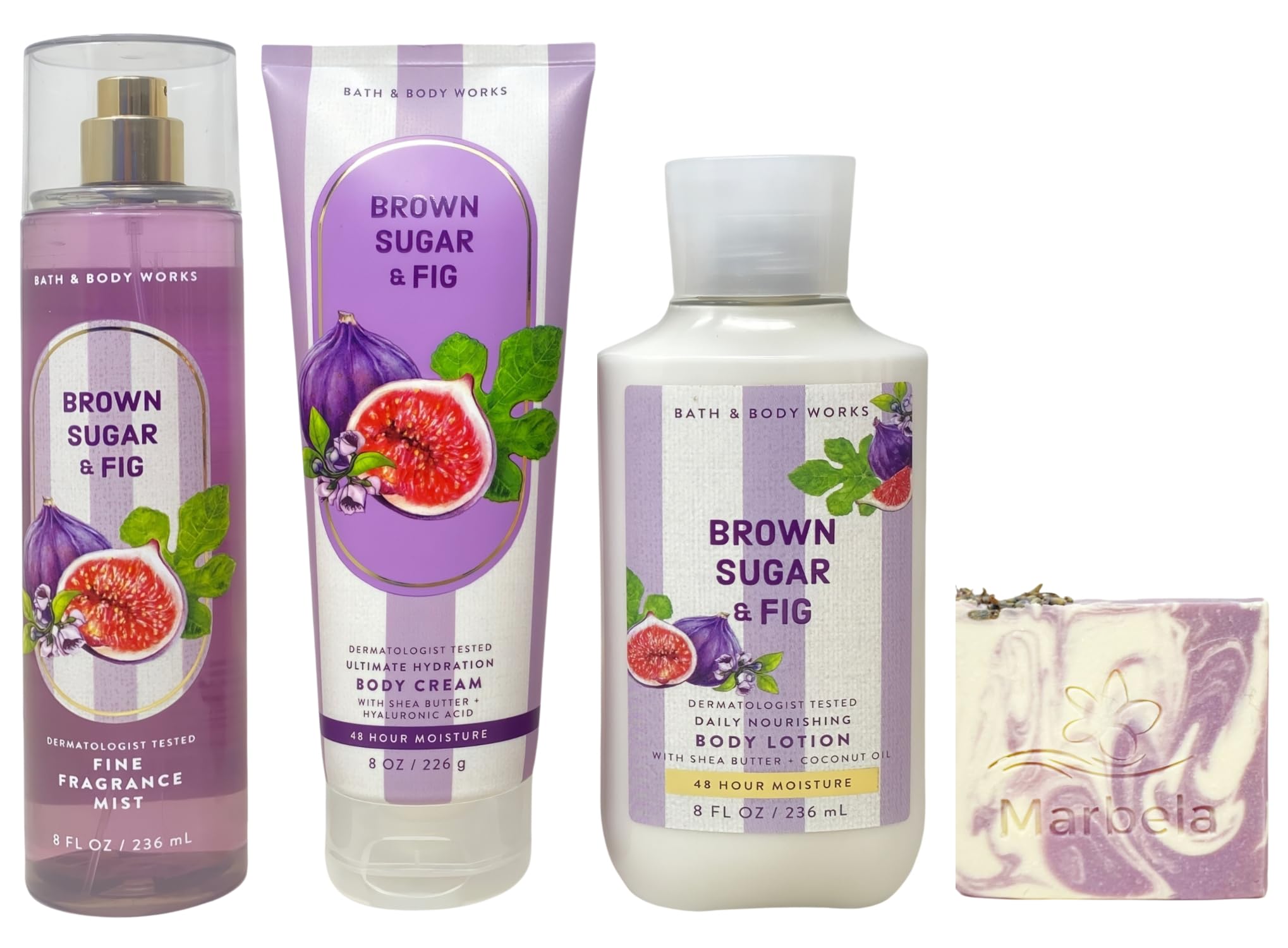 Bath Body Works Brown Sugar Fig Fine Fragrance Mist, Ultimate Hydration Body Cream and Daily Nourishing Body Lotion with a Lavender Dream Bar Soap (Ingredients: Saponified Oils of: Olive Oil, Organic Virgin Coconut Oil, Cocoa Butter, Shea Butter, Castor Oil, Sweet Almond Oil, Dried Lavender, Fragrance, Vitamin E, Kaolin Clay, Sodium Lactate, Mica Essential oils of Cedarwood Atlas, Lavender, and Orange).