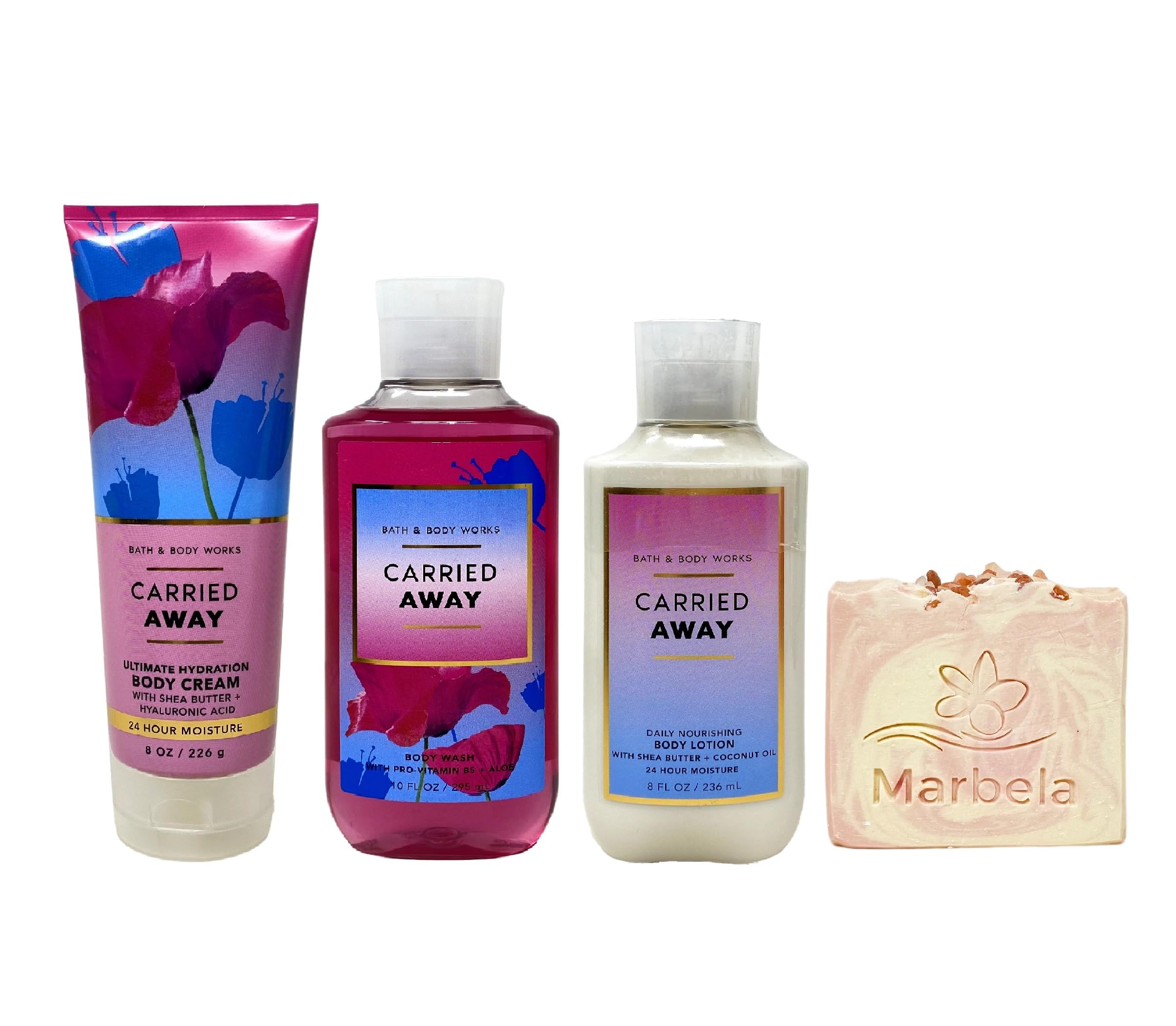 Bath Body Works Carried Away 3 Piece Bundle with a Marbela Himalayan Salts Springs Bar Soap. INCLUDES: 8 oz 226 g Ultimate Hydration Body Cream, 10 fl oz 295 mL Body Wash, 8 fl oz 236 mL Daily Nourishing Body Lotion, and a 4 oz Marbela Himalayan Salts Springs Bar Soap. Carried Away - What it smells like: getting swept off your feet by your true love. Fragrance notes: lush raspberries, juicy pear nectar, white jasmine and whipped vanilla. Marbela Himalayan Salts Springs Bar Soap - Himalayan salts help hydrate and nourish the skin, with its water absorbent properties. These minerals are known to be helpful for acne, irritated and dry skin. Himalayan Salt Springs soap has natural kaolin clay blended to further moisturize and hydrate your body. Scent: Citrusy Florals with Litsea Cubeba Essential Oil.