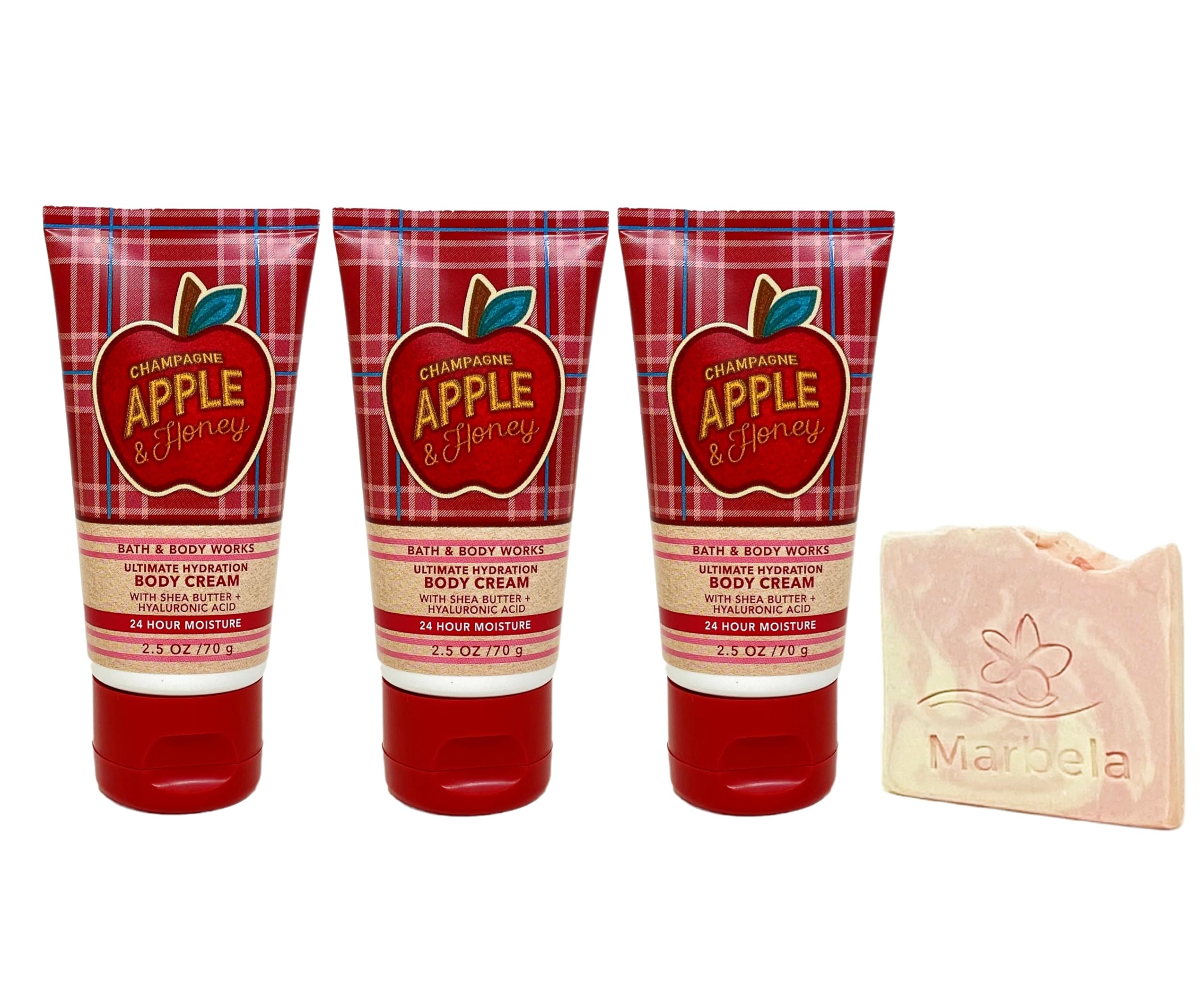 Marbela Sample Soap - While ordinary soaps dry out your skin, Marbela specializes in all-natural, moisturizing soaps and bath products that will take your self-care routine to the next level. The priority is to create products that are all-natural, vegan, cruelty-free and most importantly, handmade with love. Champagne Apple Honey - What it smells like: crisp bubbly with the sweet kiss of apple. Fragrance notes: crisp apple, sparkling champagne and jasmine honey. 3 Travel size Ultimate Hydration Body Creams (2.5 oz 70 g each) - What it does: provides intense hydration to relieve dry skin for 24-hour moisture. Bath Body Works Champagne Apple Honey Mini Body Cream Bundle with a Marbela Himalayan Salts Springs Bar Soap. (Soap May Vary).