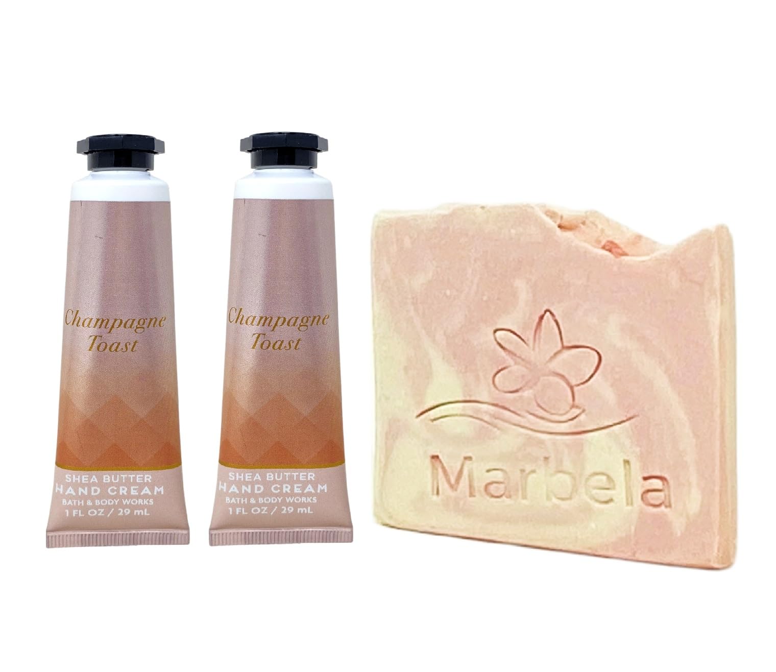 Marbela Sample Soap - While ordinary soaps dry out your skin, Marbela specializes in all-natural, moisturizing soaps and bath products that will take your self-care routine to the next level. The priority is to create products that are all-natural, vegan, cruelty-free and most importantly, handmade with love. Champagne Toast - What it smells like: a fruity, sweet, sparkling spritzer. Fragrance notes: bubbly champagne, sparkling berries and juicy tangerine. What it does: leaves your hands feeling soft, smooth and nourished. INCLUDES: 2 Hand Creams (1 fl oz 29 mL each) and a Marbela Himalayan Salts Springs Sample Soap (Soap May Vary). Bath Body Works Champagne Toast Hand Cream Bundle with a Marbela Himalayan Salts Springs Sample Soap.