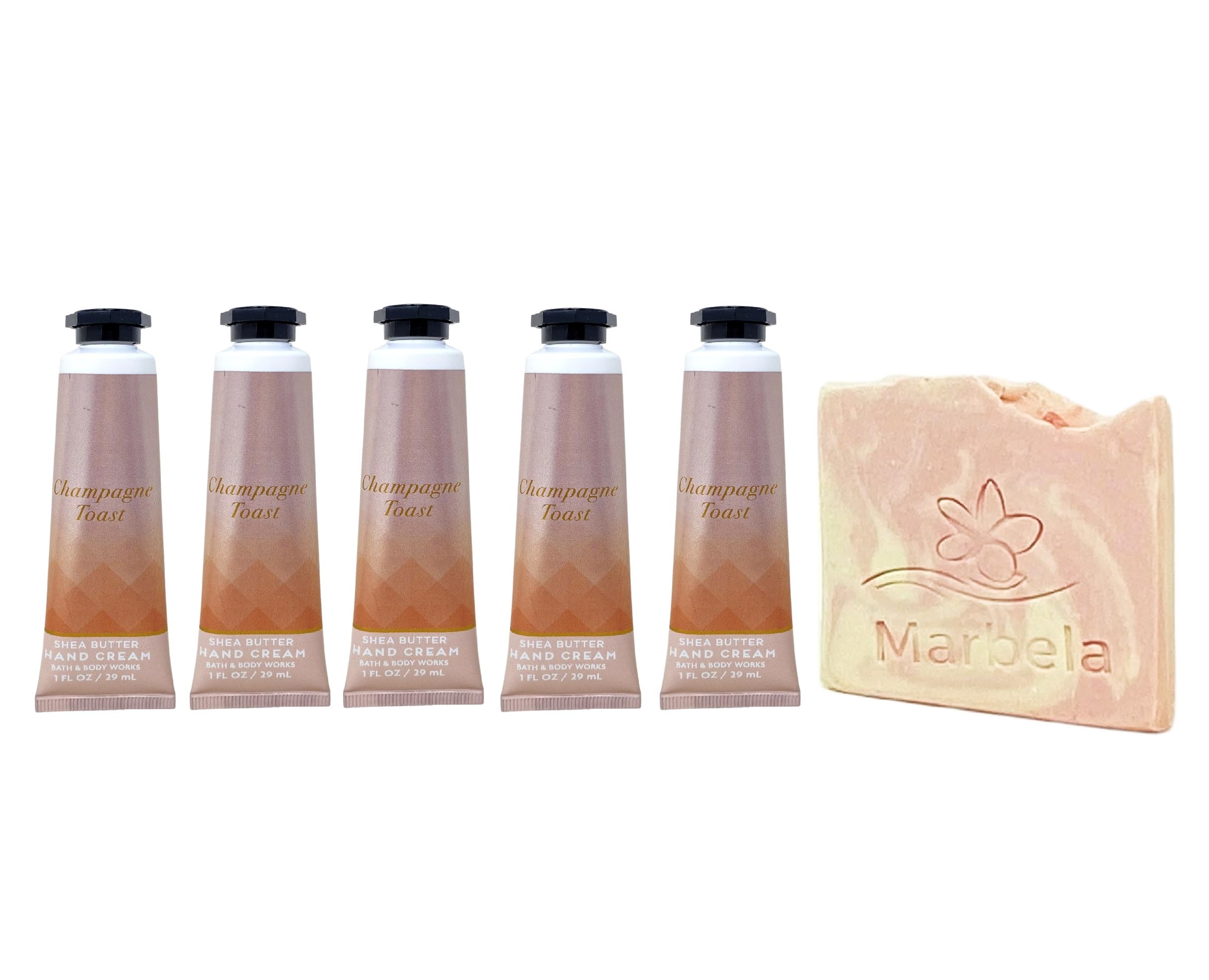 Marbela Sample Soap - While ordinary soaps dry out your skin, Marbela specializes in all-natural, moisturizing soaps and bath products that will take your self-care routine to the next level. The priority is to create products that are all-natural, vegan, cruelty-free and most importantly, handmade with love. Champagne Toast - What it smells like: a fruity, sweet, sparkling spritzer. Fragrance notes: bubbly champagne, sparkling berries and juicy tangerine. What it does: leaves your hands feeling soft, smooth and nourished. INCLUDES: 5 Hand Creams (1 fl oz 29 mL each) and a Marbela Himalayan Salts Springs Sample Soap (Soap May Vary). Bath Body Works Champagne Toast Hand Cream Bundle with a Marbela Himalayan Salts Springs Sample Soap.