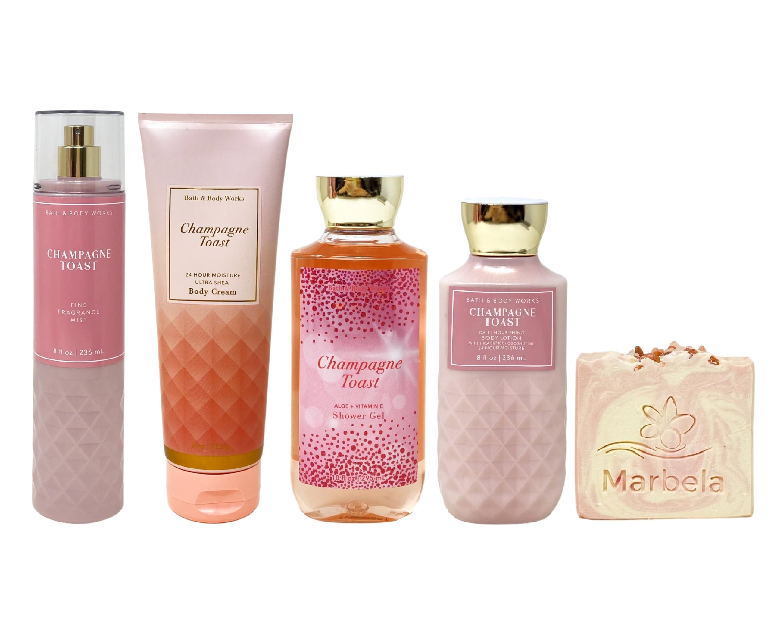 Bath Body Works Champagne Toast Deluxe Bundle with a Marbela Himalayan Salts Springs Bar Soap. INCLUDES: 8 fl oz 236 mL Fine Fragrance Mist, 8 oz 226 g Ultra Shea Body Cream, 10 fl oz 295 mL Shower Gel, 8 fl oz 236 mL Daily Nourishing Body Lotions, and a 4 oz Marbela Himalayan Salts Springs Bar Soap. Champagne Toast - What it smells like: a fruity, sweet, sparkling spritzer. Fragrance notes: bubbly champagne, sparkling berries and juicy tangerine. Marbela Himalayan Salts Springs Soap - Himalayan salts help hydrate and nourish the skin, with its water absorbent properties. These minerals are known to be helpful for acne, irritated and dry skin. Himalayan Salt Springs soap has natural kaolin clay blended to further moisturize and hydrate your body. Scent: Citrusy Florals with Litsea Cubeba Essential Oil.
