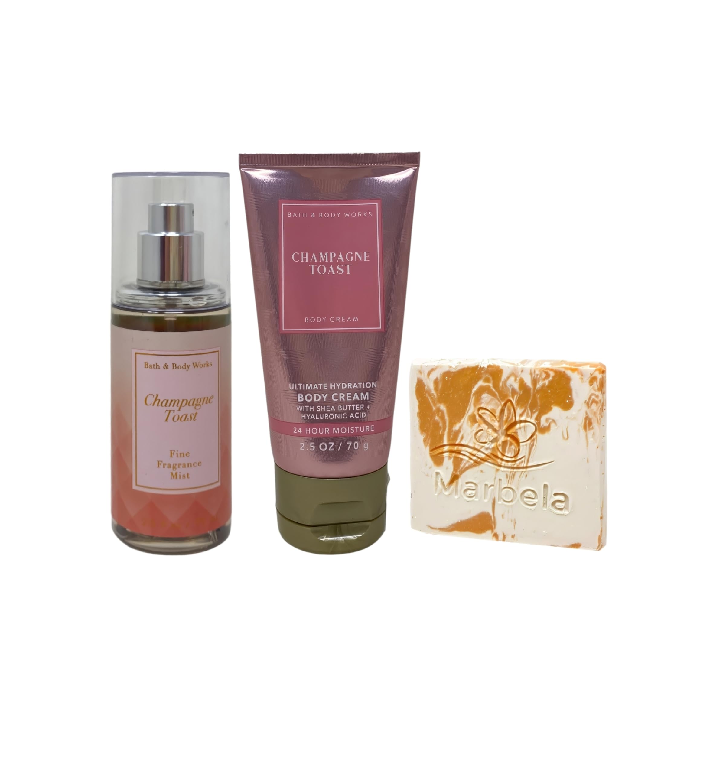 Bath & Body Works Champagne Toast Ultimate Hydration Body Cream and Fine Fragrance Mist Travel Size with a Peach Gardenia Sample Soap