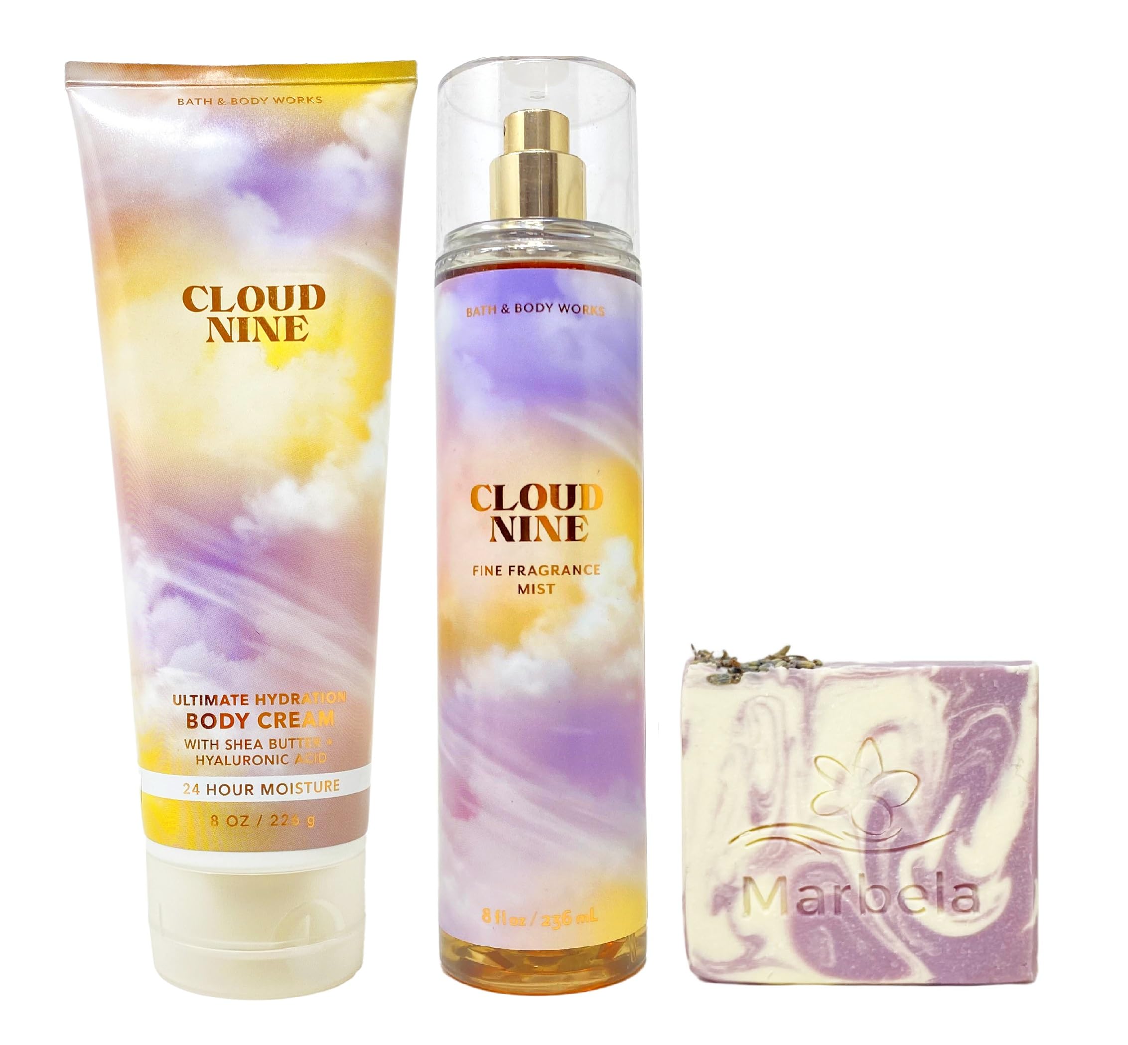 Bath Body Works Cloud Nine Fragrance Mist and Body Cream Bundle with a 4 oz Marbela Lavender Dream Bar Soap (Ingredients: Saponified Oils of: Olive Oil, Organic Virgin Coconut Oil, Cocoa Butter, Shea Butter, Castor Oil, Sweet Almond Oil, Dried Lavender, Fragrance, Vitamin E, Kaolin Clay, Mica Essential oils of Cedarwood Atlas, Lavender, Geranium).
