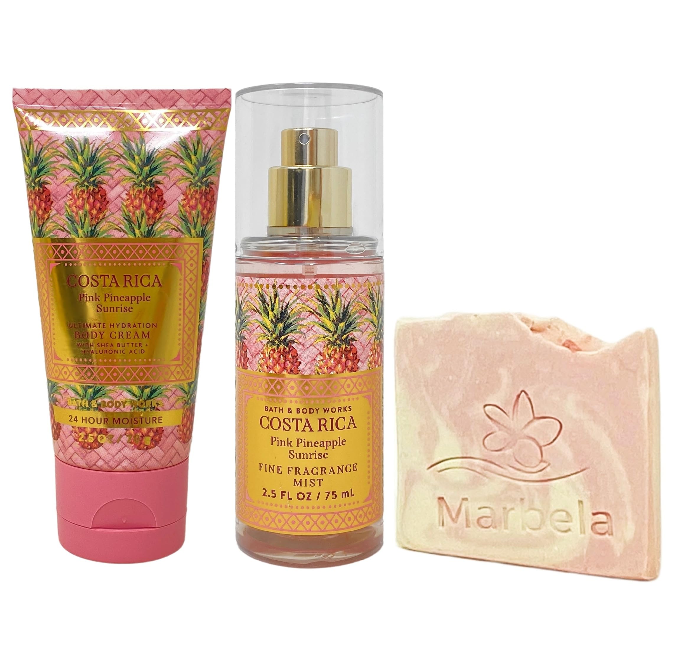 Bath Body Works Costa Rica Pink Pineapple Sunrise Body Cream and Fragrance Mist Duo Set with a Marbela Himalayan Salts Springs Sample Soap (Ingredients: Saponified Oils of: Olive Oil, Organic Virgin Coconut Oil, Shea Butter, Castor Oil, Himalayan Salts, Kaolin Clay, Fragrance, Vitamin E, Mica, Litsea Cubeba Essential Oil, Titanium Dioxide, Sodium Lactate).