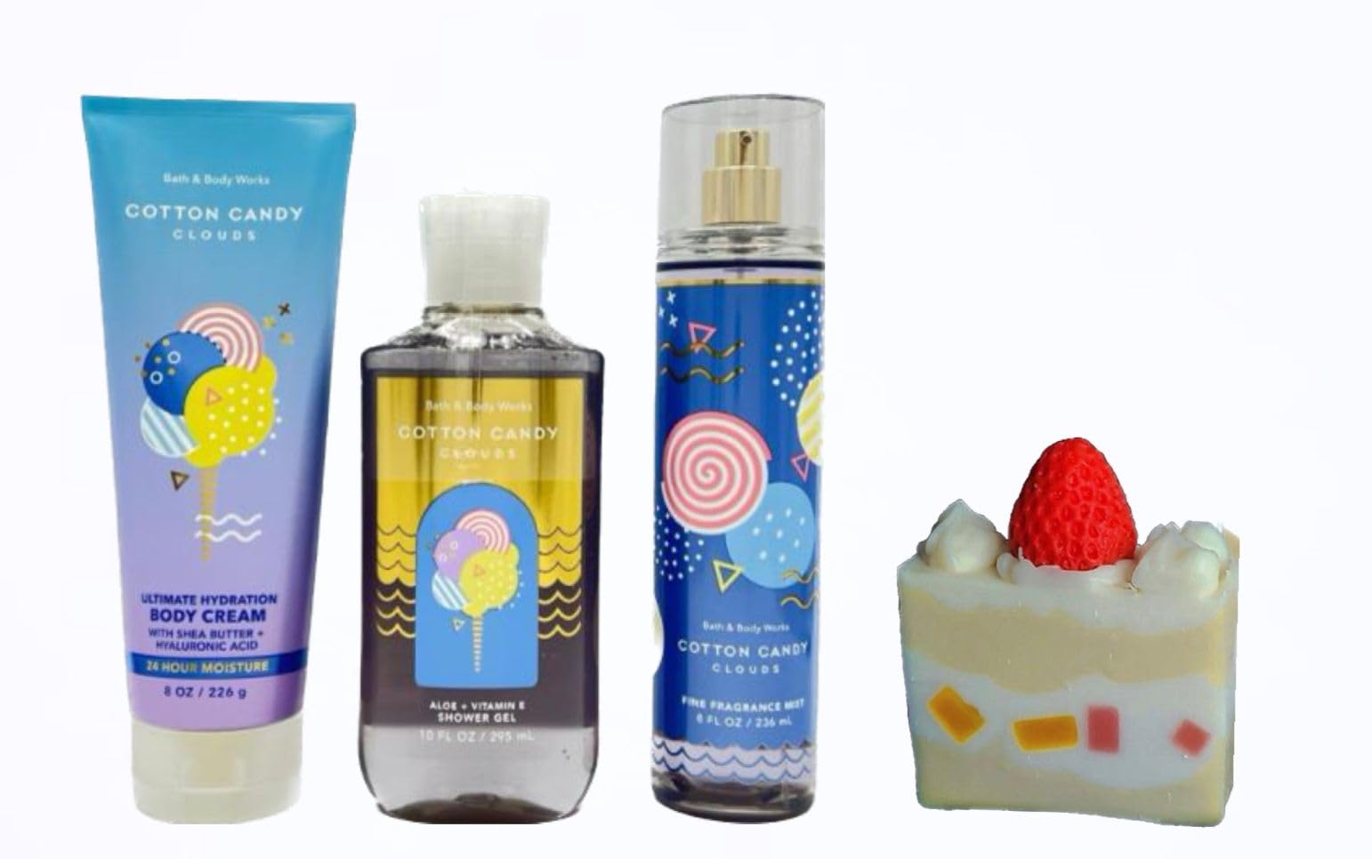 Bath Body Works-COTTON CANDY CLOUDS - 3 Piece Bundle - Fragrance Mist - Body Cream - Shower Gel and Strawberry Cake Soap Natural