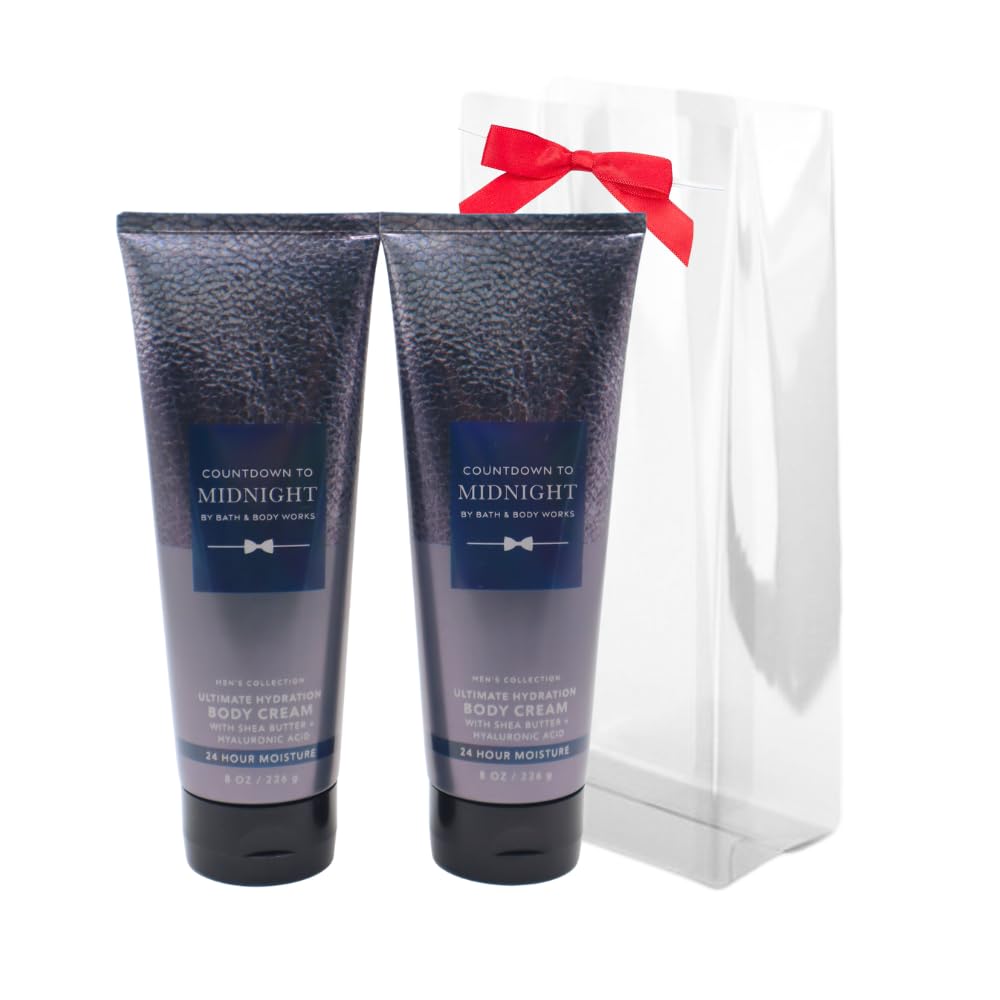 8 oz – Pack of 2. Comes with a plastic bag and a red bow – set for holidays or any occasion. Fragrance Notes: Smooth Scotch a Night of Celebrations. Bath Body Works Countdown to Midnight smells like ringing in a new year with those you love most. Bath Body Works Countdown to Midnight Ultimate Hydration Body Cream - leaves your skin feeling soft, smooth, and replenished. Infused with good stuff such as hyaluronic acid and shea butter. Bath Body Works Countdown to Midnight Ultimate Hydration Body Cream for Men.