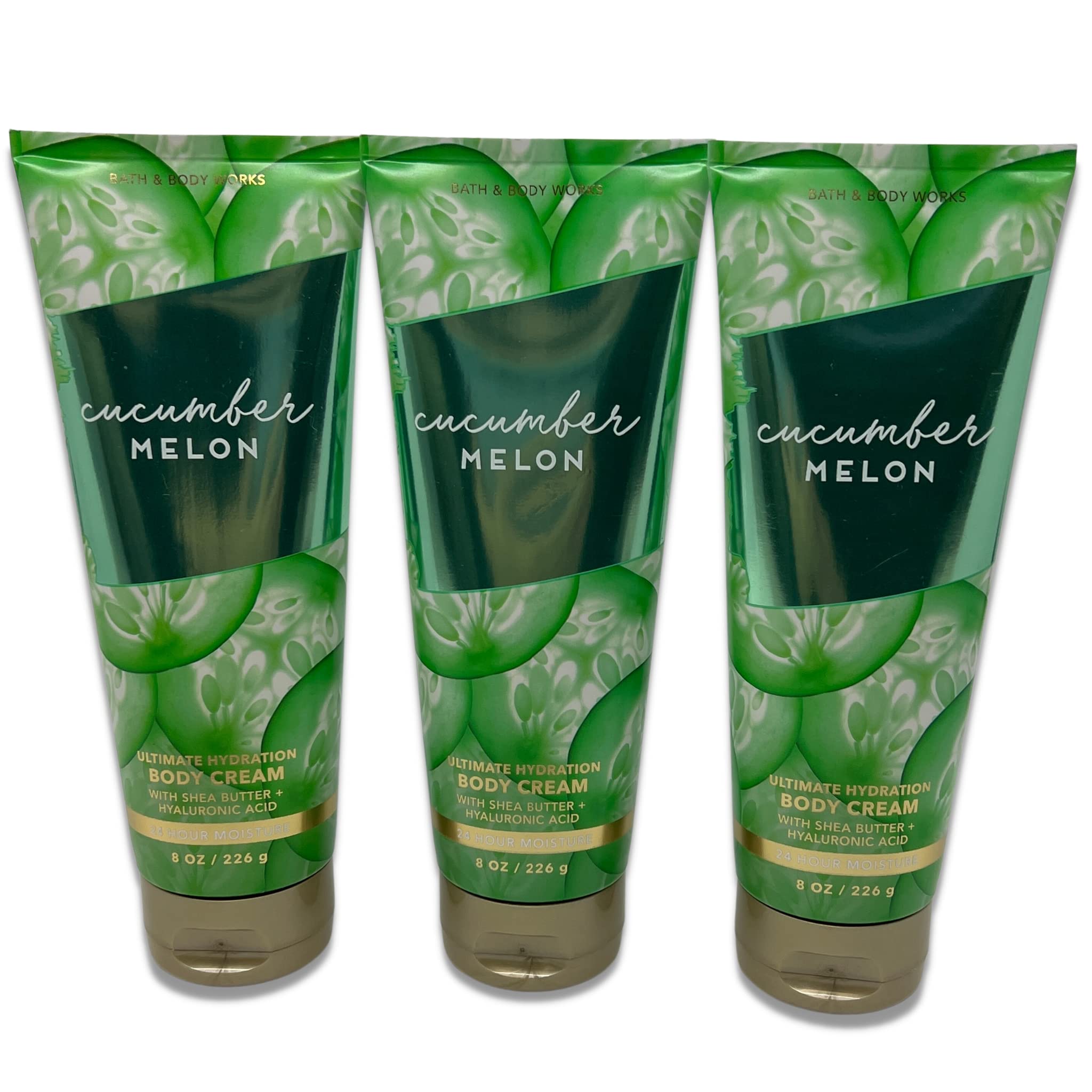 Bath Body Works Cucumber Melon Ultimate Hydration Body Cream 8oz - Pack of 3 (Bottle Artwork Color May Vary as Seasonally Refreshed by Manufacturer). 24-hour moisture- Rich Luxurious for instant moisturization Leaves skin feeling soft, smooth replenished. Fragrance notes: Crisp Cucumber, Watery Honeydew, Summer Cantaloupe, Sparkling Grapefruit, Sheer Woods.