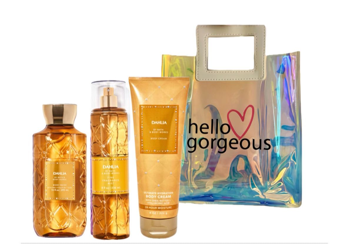 Bath & Body Works - Dahlia - 3 Piece Bundle - Spray - Body Cream - Shower Gel - Full Size and Hello Gorgeous Gift Bag.