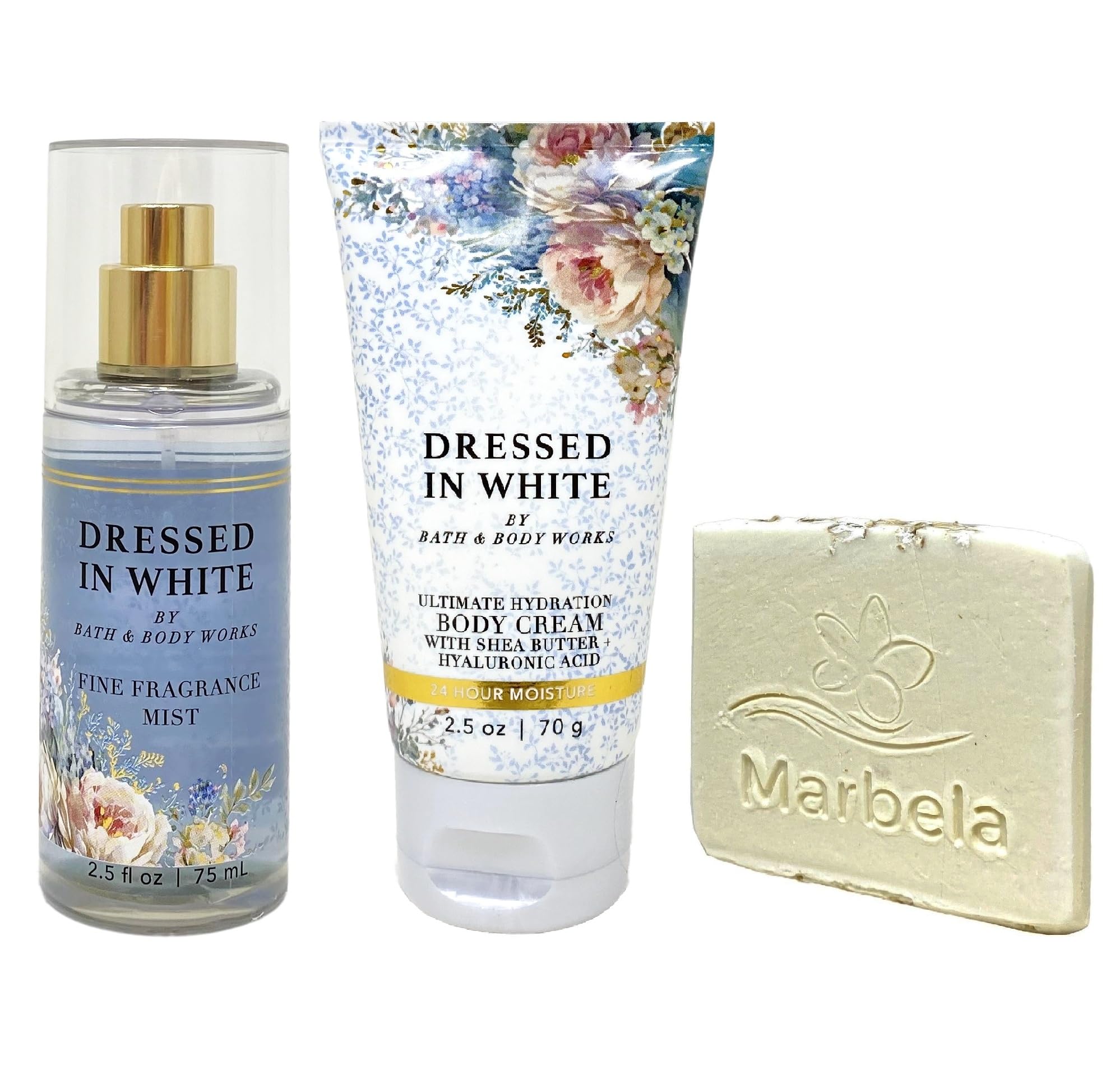 Bath Body Works Dressed In White - Fine Fragrance Mist And Ultimate Hydration Body Cream with Natural Oats Soap Sample - Travel size(Soap May Vary) (Ingredients: Saponified Oils of: Olive Oil, Organic Virgin Coconut Oil, Shea Butter, Sweet Almond Oil, Castor Oil, Vitamin E, Oats, Titanium Dioxide)