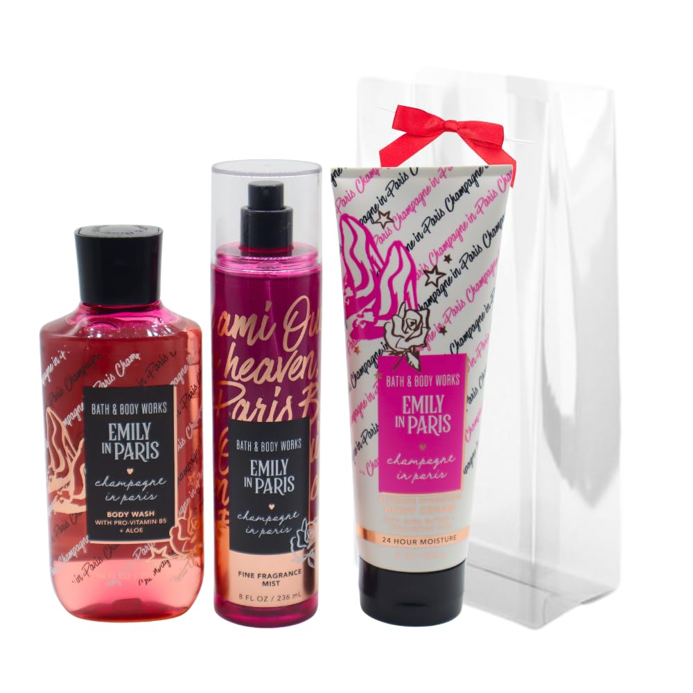 Fragrance Notes: Champagne Spritz, Elderberry Fizz, and Lily of the Valley. Bath Body Works Emily in Paris Collections Champagne in feel extra France-y and do it the Parisian way with a bottle of bubbly to sip and one to spray. Bath Body Works Emily in Paris Champagne in Paris Shower Gel - gentle, non-drying formula, nourishing, rich, bubbly lather made with aloe and Vitamin E. Bath Body Works Emily in Paris Champagne in Paris Ultimate Hydration Body Cream - this rich luxurious instant moisturization leaves the skin feeling soft, smooth, and replenished. Bath Body Works Emily in Paris Champagne in Paris Fine Fragrance Mist - will make you fall in love with the first mist whether you spritz it on lightly or lavishly. Bath Body Works Emily in Paris Champagne in Paris 3-piece bundle for Women.