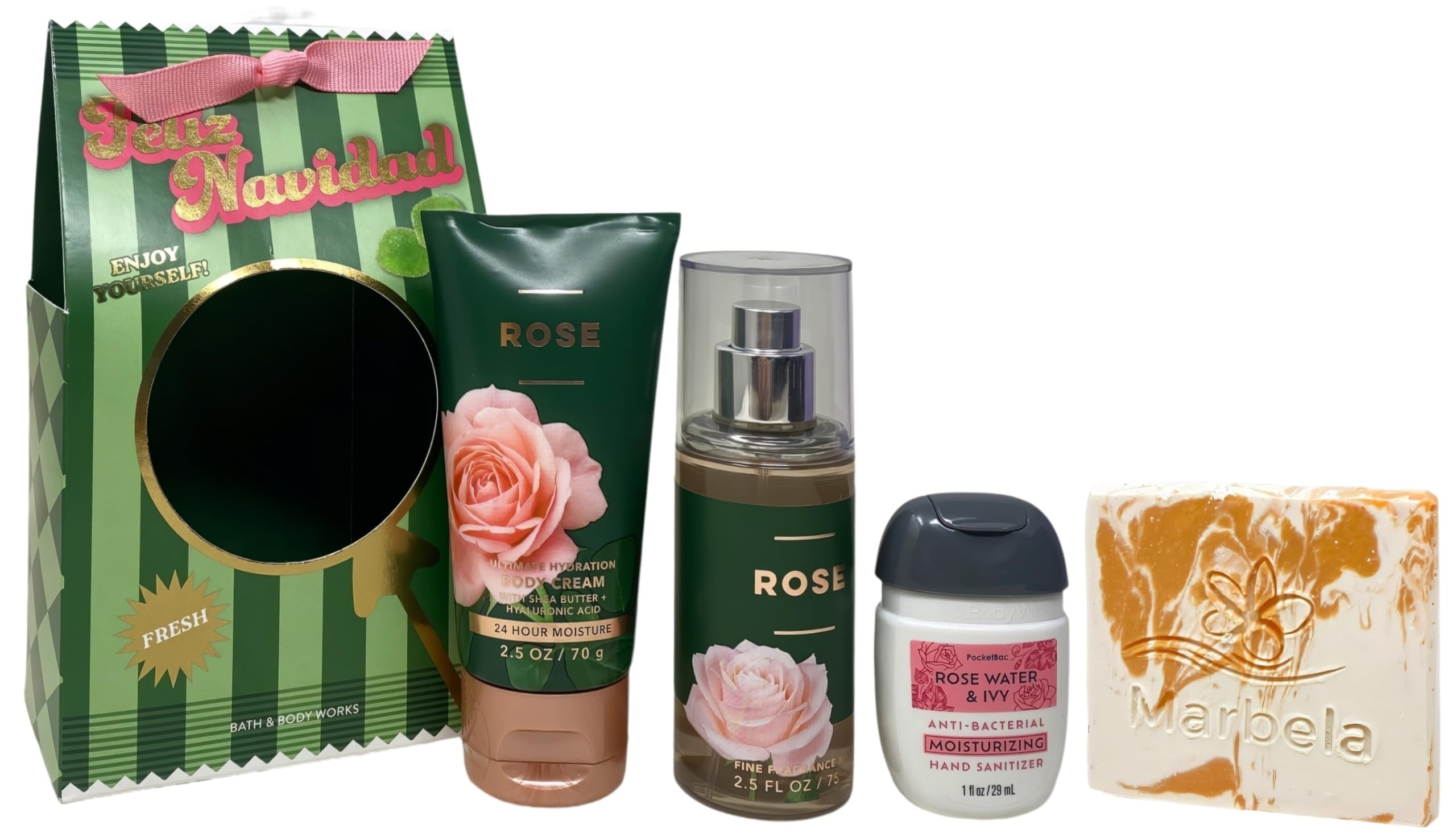 Bath & Body Works Feliz Navidad Rose Gift Set - Fine Fragrance Mist Ultimate Hydration Body Cream and Rose Water & Ivy Hand Gel - with a Peach Gardenia Sample Soap - Travel size
