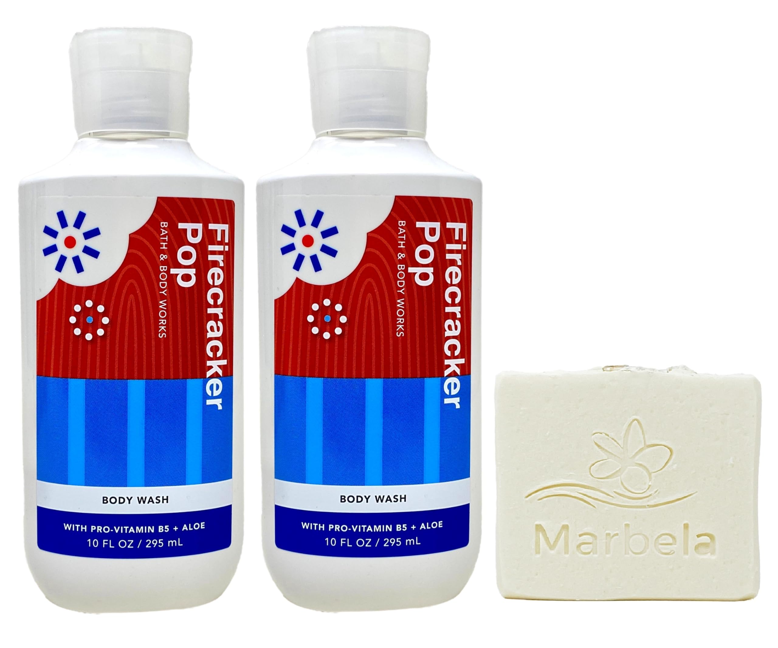 Marbela Natural Oats Bar Soap: Natural Oats is our most gentle formula for any skin type! Oats help to cleanse, exfoliate and soothe irritation. In addition, the sweet almond oil leaves skin soft and pampered. This soap was made for people with sensitive skin because we realize what a battle that can be. Notes of: This soap is UNSCENTED in order to be sensitive skin friendly. Firecracker Pop - What it smells like: that fruity red, white and blue popsicle you loved as a kid. Fragrance notes: red cherry, fresh citrus and juicy berry. 2 Pro-Vitamin B5 Aloe Body Washes (10 fl oz 295 ml each) - What it does: gently cleanses your skin with a rich, bubbly lather. Gentle and non-drying. Bath Body Works Firecracker Pop Body Wash with a 4 oz Marbela Natural Oats Bar Soap. (Soap May Vary).