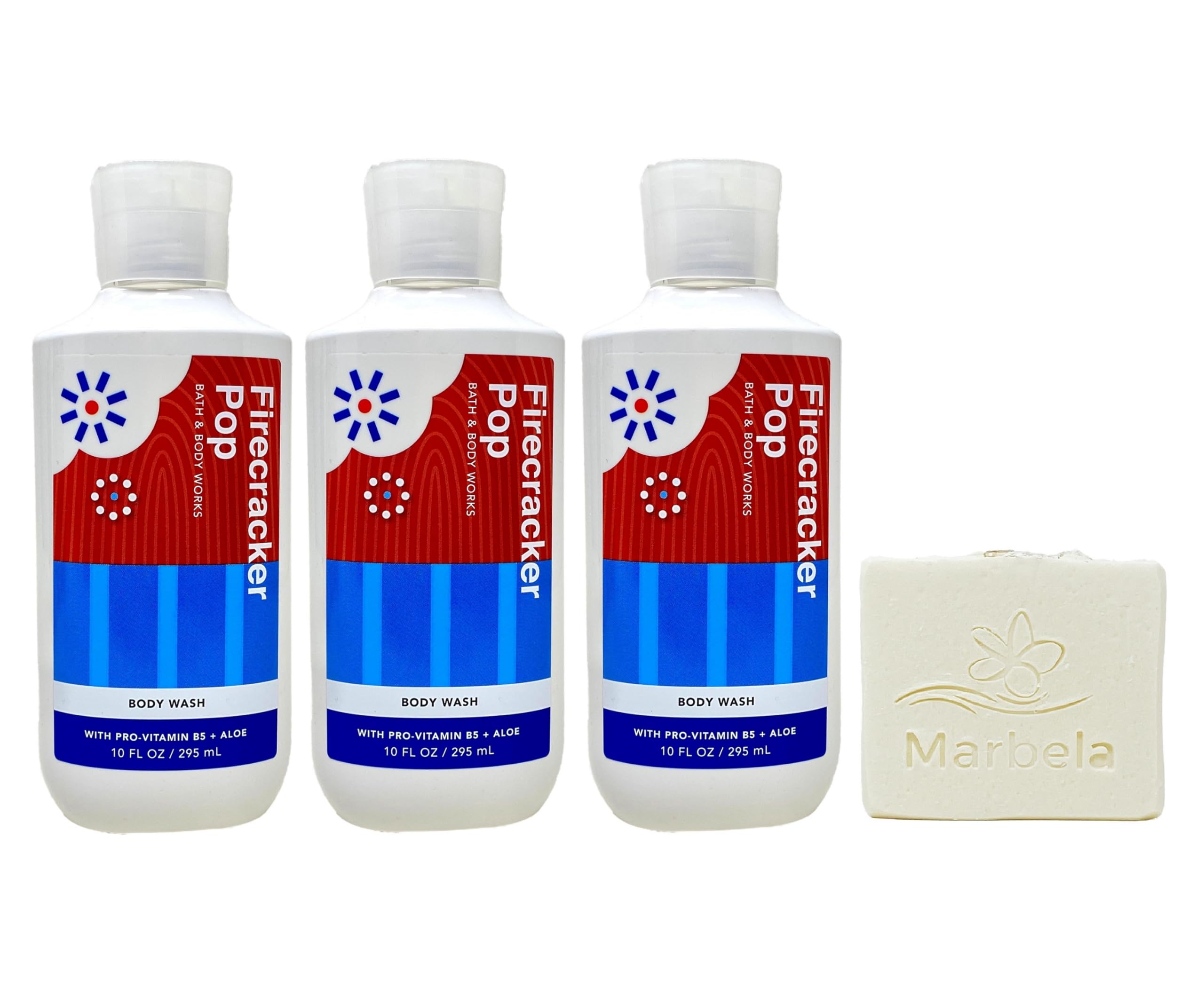 Bath Body Works Firecracker 3 Pack Body Wash with a Marbela Natural Oats Bar Soap (Handmade, Vegan Friendly, Cruelty Free). Notes of: This soap is UNSCENTED in order to be sensitive skin friendly.