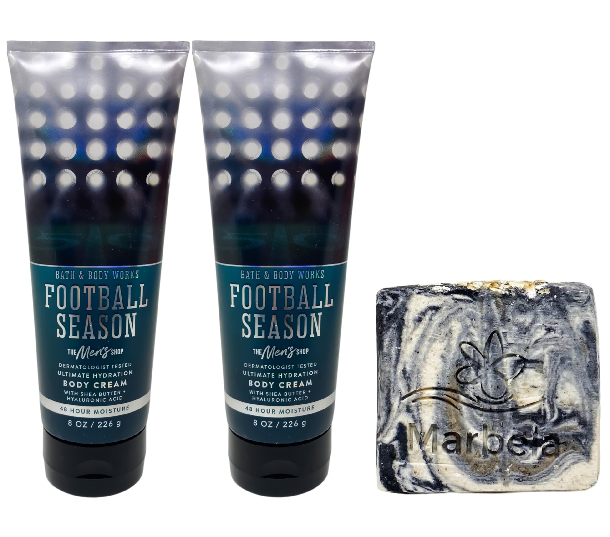 Natural Oats Sample soap - Is our most gentle formula for any skin type! Oats help to cleanse, exfoliate and soothe irritation. In addition, the sweet almond oil leaves skin soft and pampered. This soap was made for people with sensitive skin because we realize what a battle that can be. What it does: hydrates intensely to relieve dry skin—now moisturizing for up to 48 hours. Football Season What it smells like: Cozy up on the bleachers with a warm flannel blanket—it's game time! Fragrance notes: fresh eucalyptus, blue sage and cedarwood. 2 Bath Body Works Ultimate Hydration Body Cream with Shea Butter Hyaluronic Acid 48 hs Moisture (8 oz 226 g Each) - What it does: hydrates intensely to relieve dry skin - now moisturizing for up to 48 hours. Bath Body Works Football Season with a Charcoal Scrub Soap (Soap May Vary).