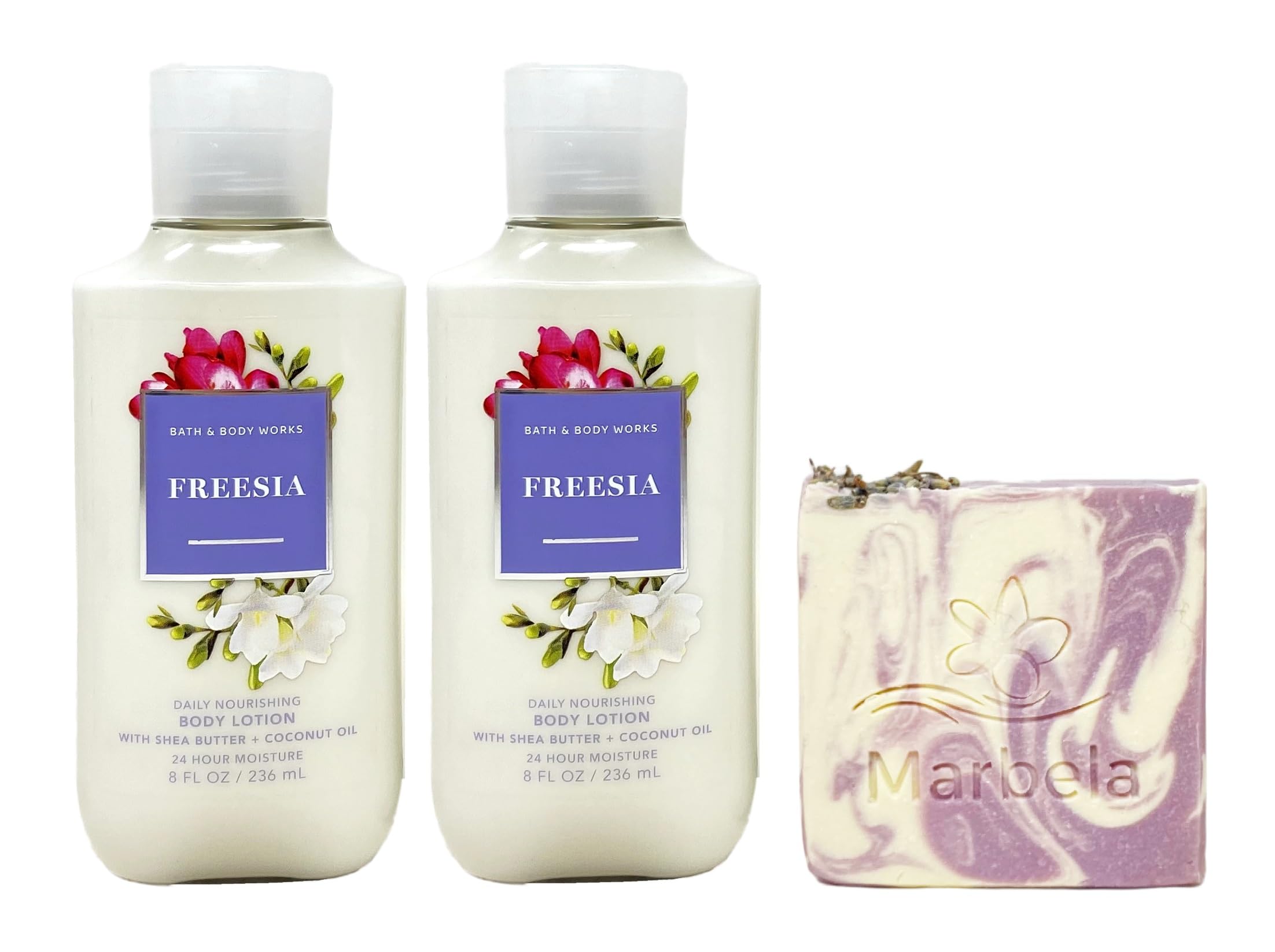 Bath Body Works Freesia Daily Nourishing Body Lotion Bundle with a Marbela Lavender Dream Bar Soap. INCLUDES: 2 Daily Nourishing Body Lotions (8 fl oz 236 mL each) and a 4 oz Marbela Bar Soap