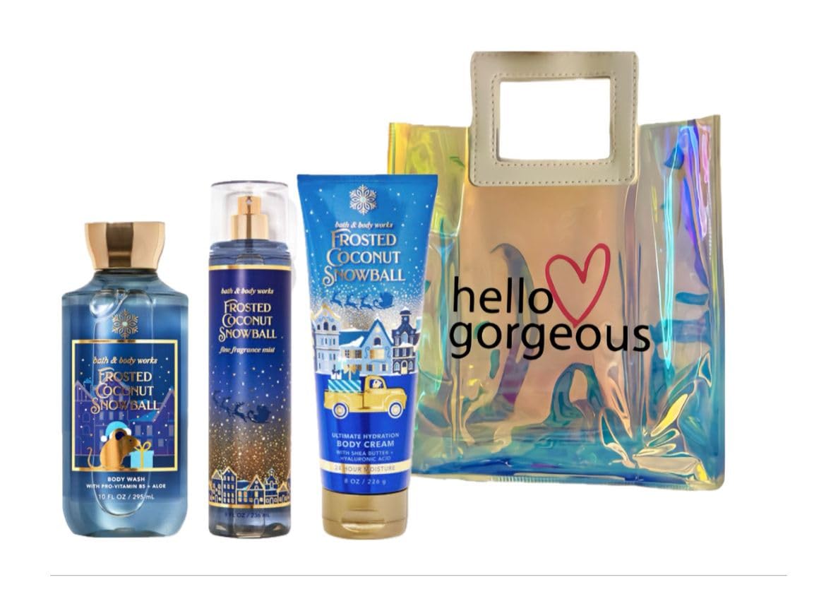 Bath Body Works -Frosted Coconut Snowball - 3 Piece Bundle - Spray - Body Cream - Shower Gel - Full Size and Hello Gorgeous Gift Bag.