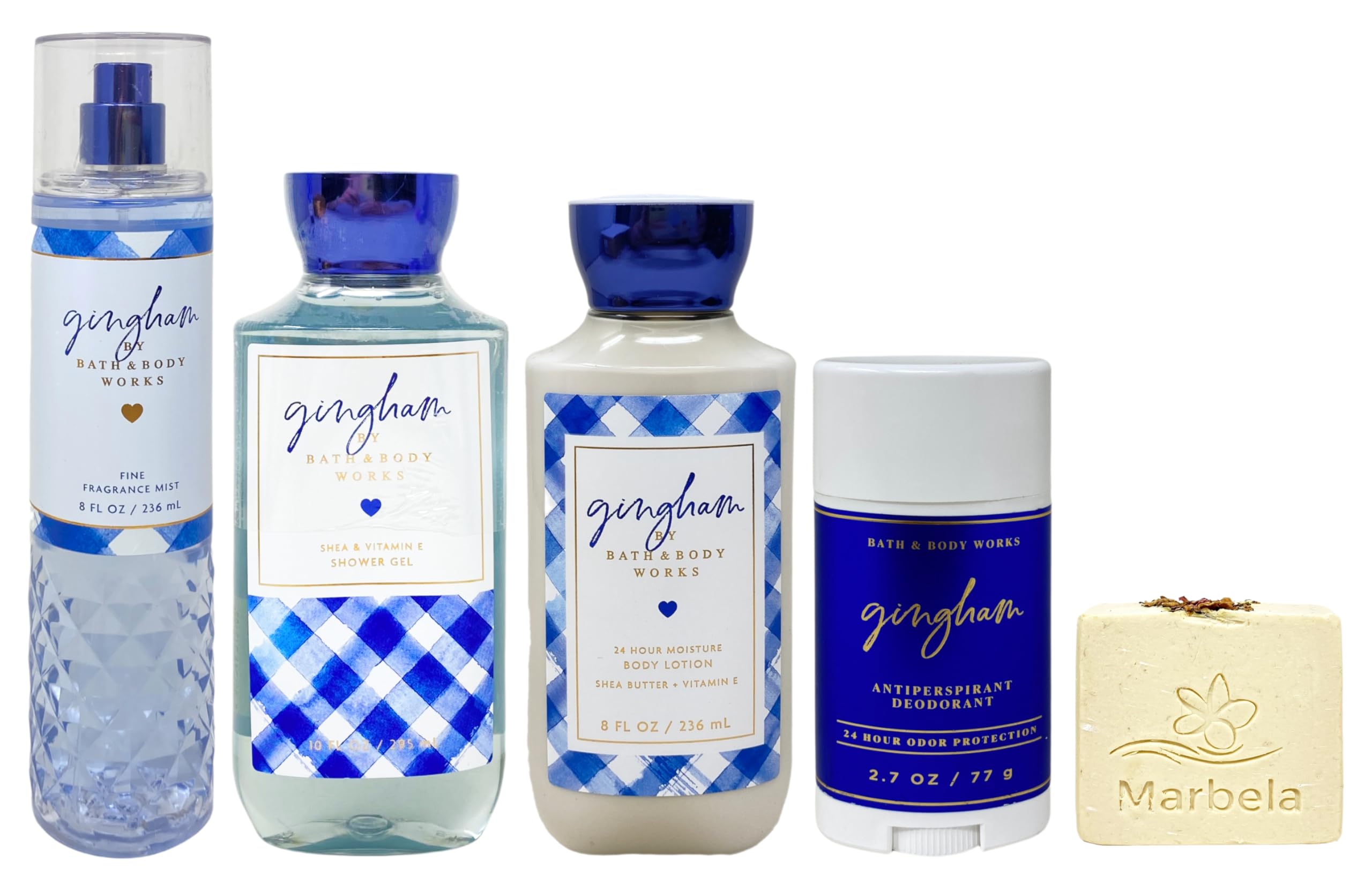 Creamy Rose: You have come to the right place. Roses and oats combine to create a sweet and delicate scrub that works to gently exfoliate.The creaminess of the soap dually moisturizes and smoothens. Gingham Fragrance notes: blue freesia, white peach, fresh clementine, violet and clean musk. Body Lotion With Shea Butter Vitamin E (8 Fl Oz 236 ml). What it does: provides 24 hours of continuous moisture so your skin feels soft, nourished and conditioned. Antiperspirant Deodorants (2.7 oz 77 g Each). What it does: protects against sweat and provides 24-hour odor protection. Shower Gel with Shea Vitamin E (10 fl oz 295 mL). What it does: gently cleanses your skin with a rich, bubbly lather. Fine Fragrance Mist (8 fl oz 236 mL). What it does: scents your skin with a mist that layers so well with the rest of your routine. Bath Body Works Gingham with a Creamy Rose Bar Soap (Soap May Vary).
