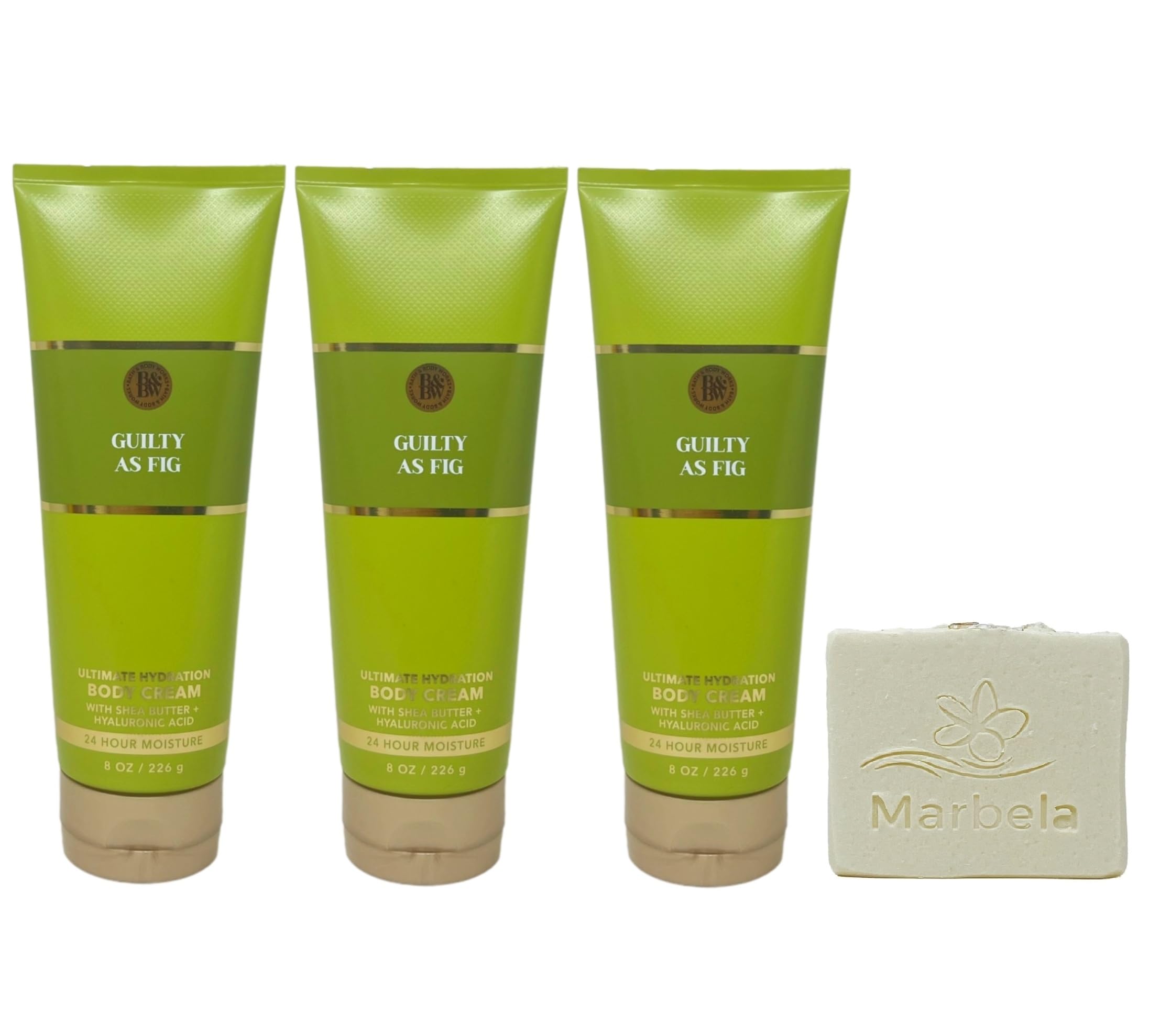 Marbela Natural Oats Bar Soap - Natural Oats is our most gentle formula for any skin type! Oats help to cleanse, exfoliate and soothe irritation. In addition, the sweet almond oil leaves skin soft and pampered. This soap was made for people with sensitive skin because we realize what a battle that can be. Guilty As Fig - What it smells like: a vivid, vibrant experience of playful fruit and blooming florals. Fragrance notes: fig nectar, lush jasmine and creamy musk. 3 Ultimate Hydration Body Creams (8 oz 226 g each) - What it does: provides intense hydration to relieve dry skin for 24-hour moisture. Bath Body Works Guilty As Fig Body Cream Bundle with a 4 oz Marbela Natural Oats Bar Soap. (Soap May Vary).