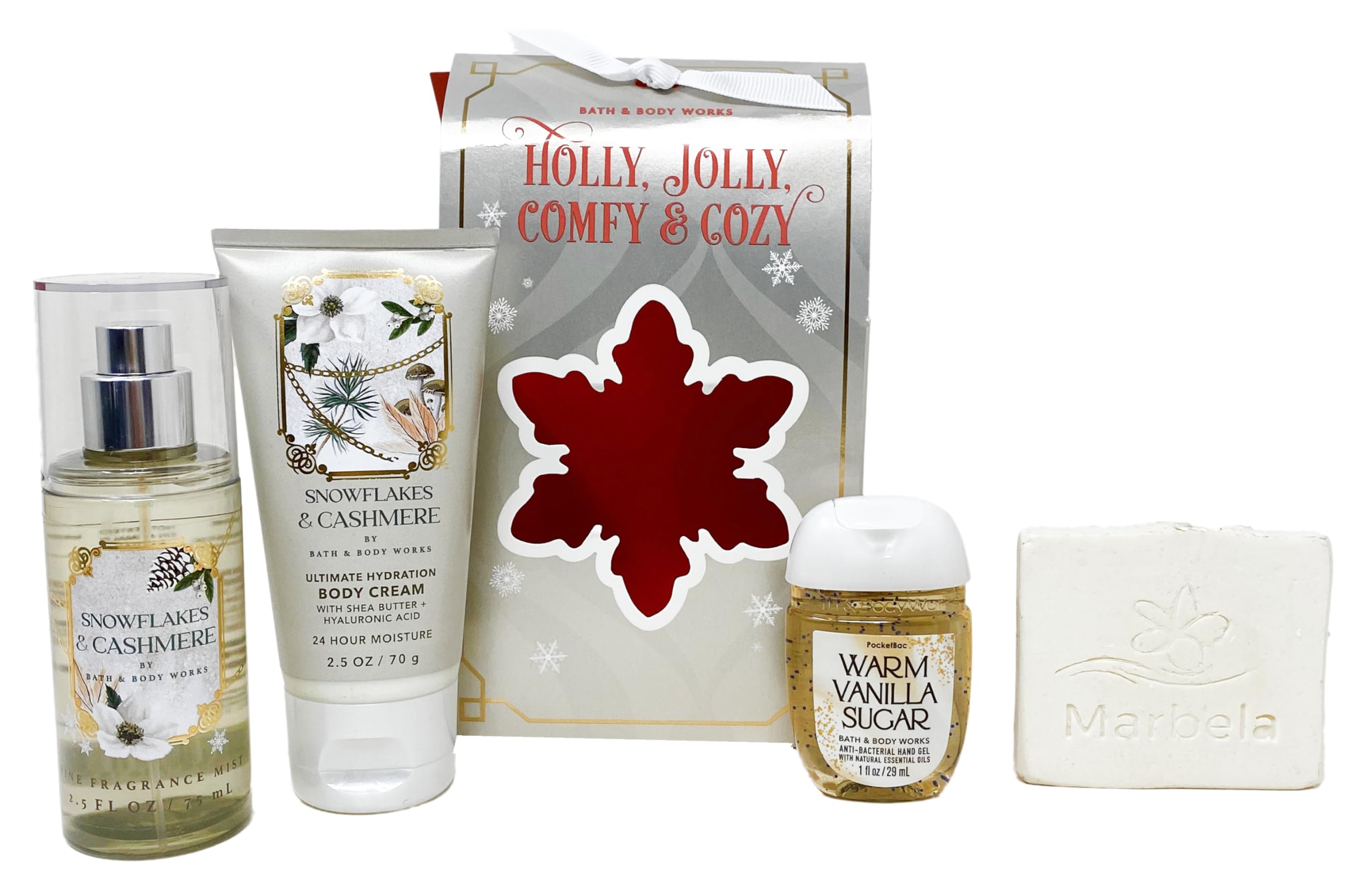 Bath Body Works Holly, Jolly, Comfy Cozy - Mini Gift Box Set - Snowflakes Cashmere Fine Fragrance Mist,Body Cream and Warm Vanilla Sugar Pocket Hand Gel With a Natural Oats Sample Soap., white