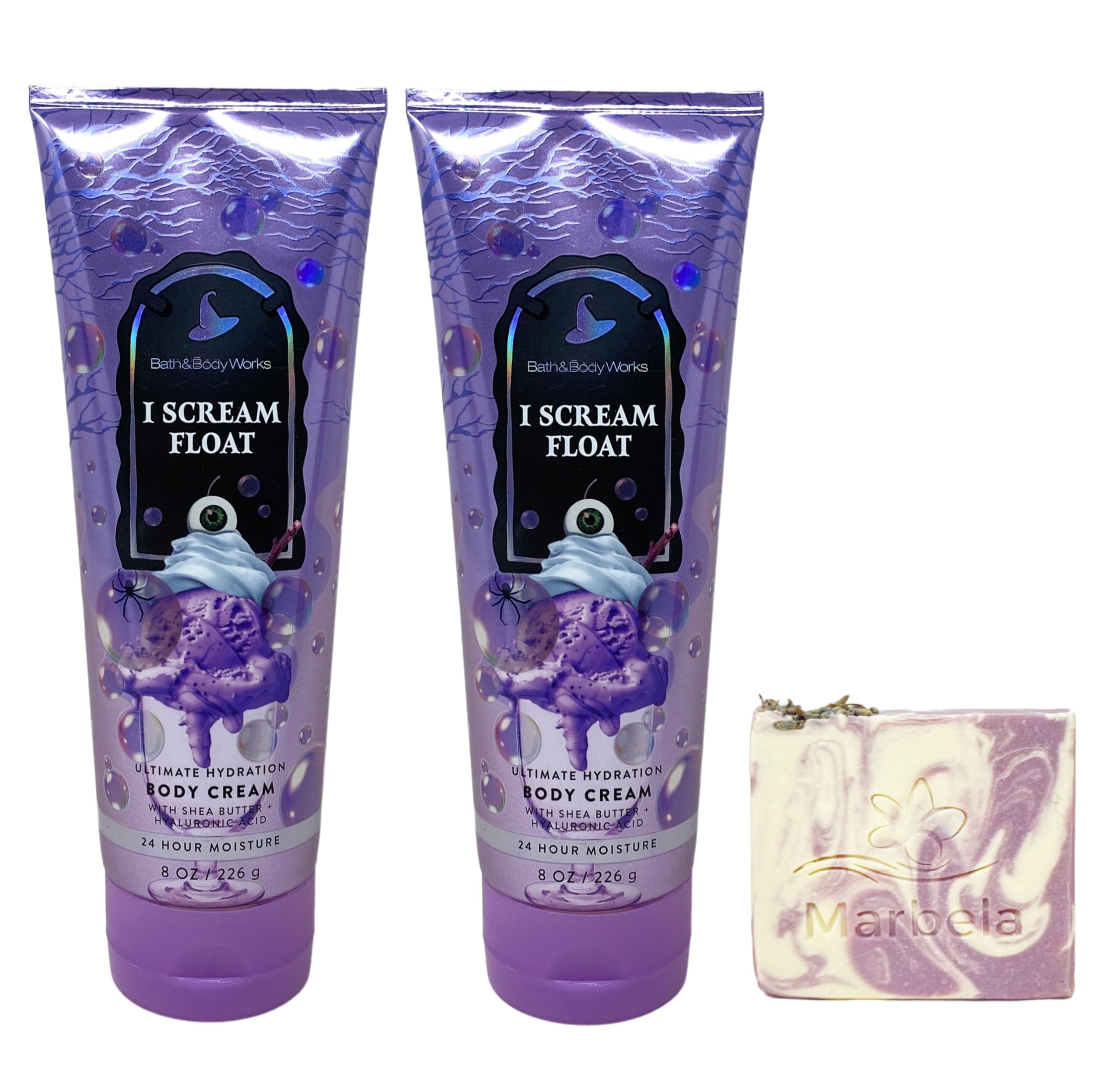Bath Body Works I Scream Float 2 Pack Body Cream Bundle with a 4 oz Marbela Lavender Dream Bar Soap (Ingredients: Saponified Oils of: Olive Oil, Organic Virgin Coconut Oil, Cocoa Butter, Shea Butter, Castor Oil, Sweet Almond Oil, Dried Lavender, Fragrance, Vitamin E, Kaolin Clay, Sodium Lactate, Mica Essential oils of Cedarwood Atlas, Lavender, and Orange).