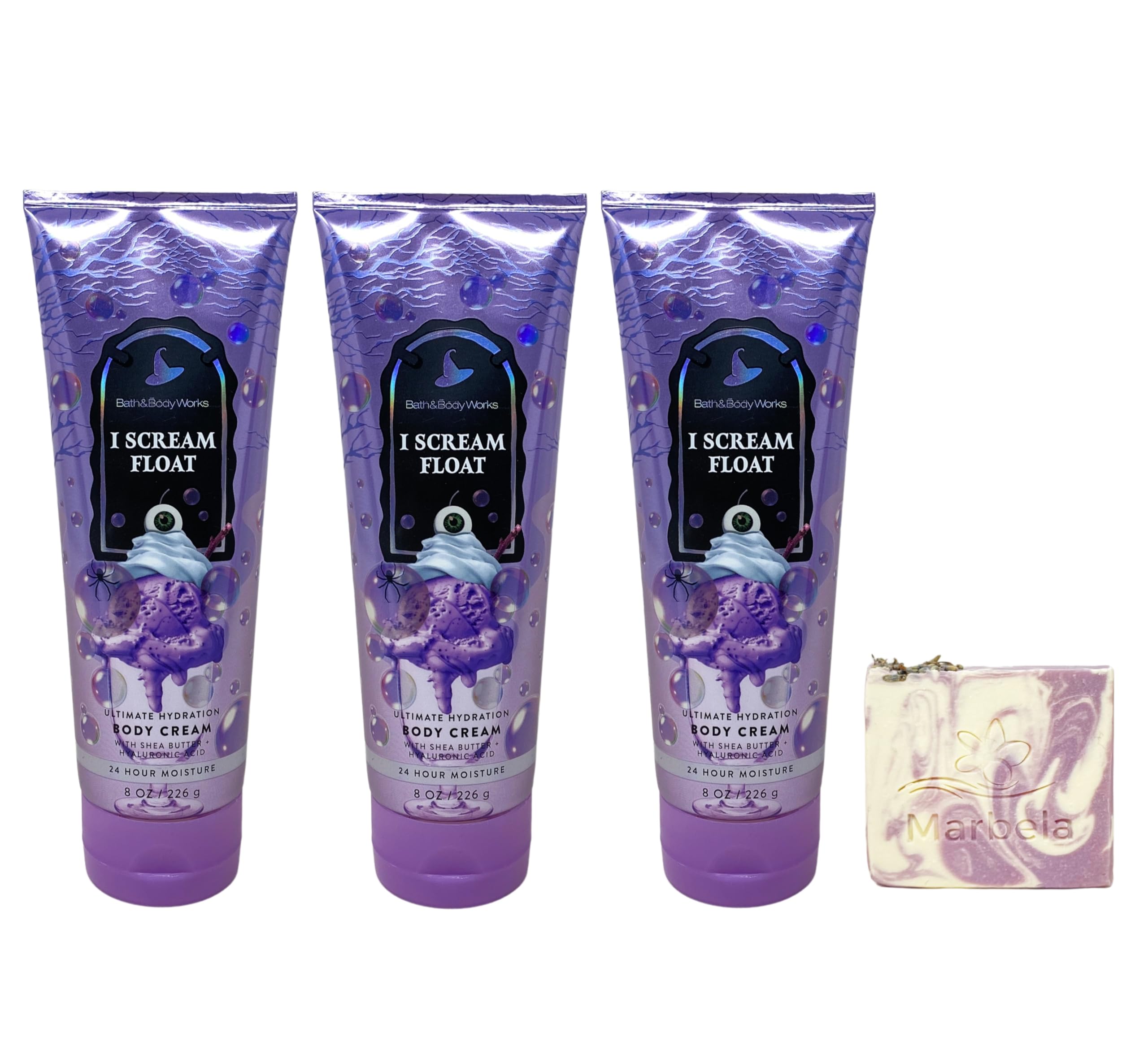 Marbela Lavender Dream Bar Soap - Formulated with nourishing sweet almond oil, this bar is designed to leave your skin feeling smooth, hydrated, and refreshed. Finely milled lavender flowers and essential oils provide a rich, creamy lather that cleanses effectively without over-drying. I Scream Float - What it smells like: a bubbly, bewitching concoction that satisfies your sweet tooth. Fragrance notes: fizzing cola, frightful vanilla float and spooky sugars. 3 Ultimate Hydration Body Creams (8 oz 226 g each) - What it does: provides intense hydration to relieve dry skin for 24-hour moisture. Bath Body Works I Scream Float Body Cream Bundle with a 4 oz Marbela Lavender Dream Bar Soap (Soap May Vary).