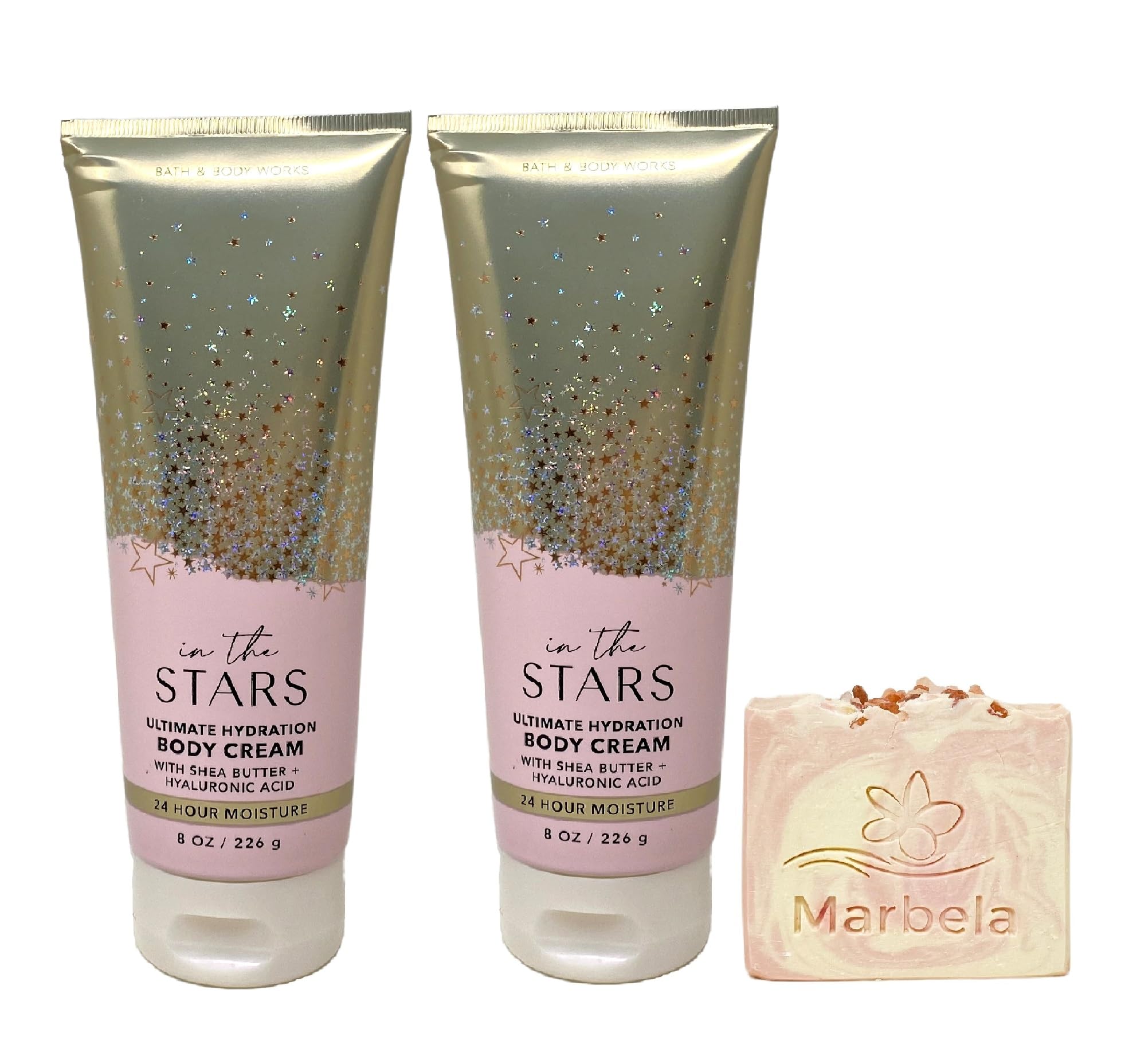 Bath Body Works In The Stars Body Cream Bundle with a Marbela Himalayan Salts Springs Bar Soap. INCLUDES: 2 Ultimate Hydration Body Creams (8 oz 226 g each) and a 4 oz Marbela Himalayan Salts Springs Bar Soap. In The Stars - What it smells like: seeing a once-in-a-lifetime comet cross a dark sky. Fragrance notes: starflower, sandalwood musk, sugared tangelo, white agarwood, radiant amber. Marbela Himalayan Salts Springs Soap - Himalayan salts help hydrate and nourish the skin, with its water absorbent properties. These minerals are known to be helpful for acne, irritated and dry skin. Himalayan Salt Springs soap has natural kaolin clay blended to further moisturize and hydrate your body. Scent: Citrusy Florals with Litsea Cubeba Essential Oil.