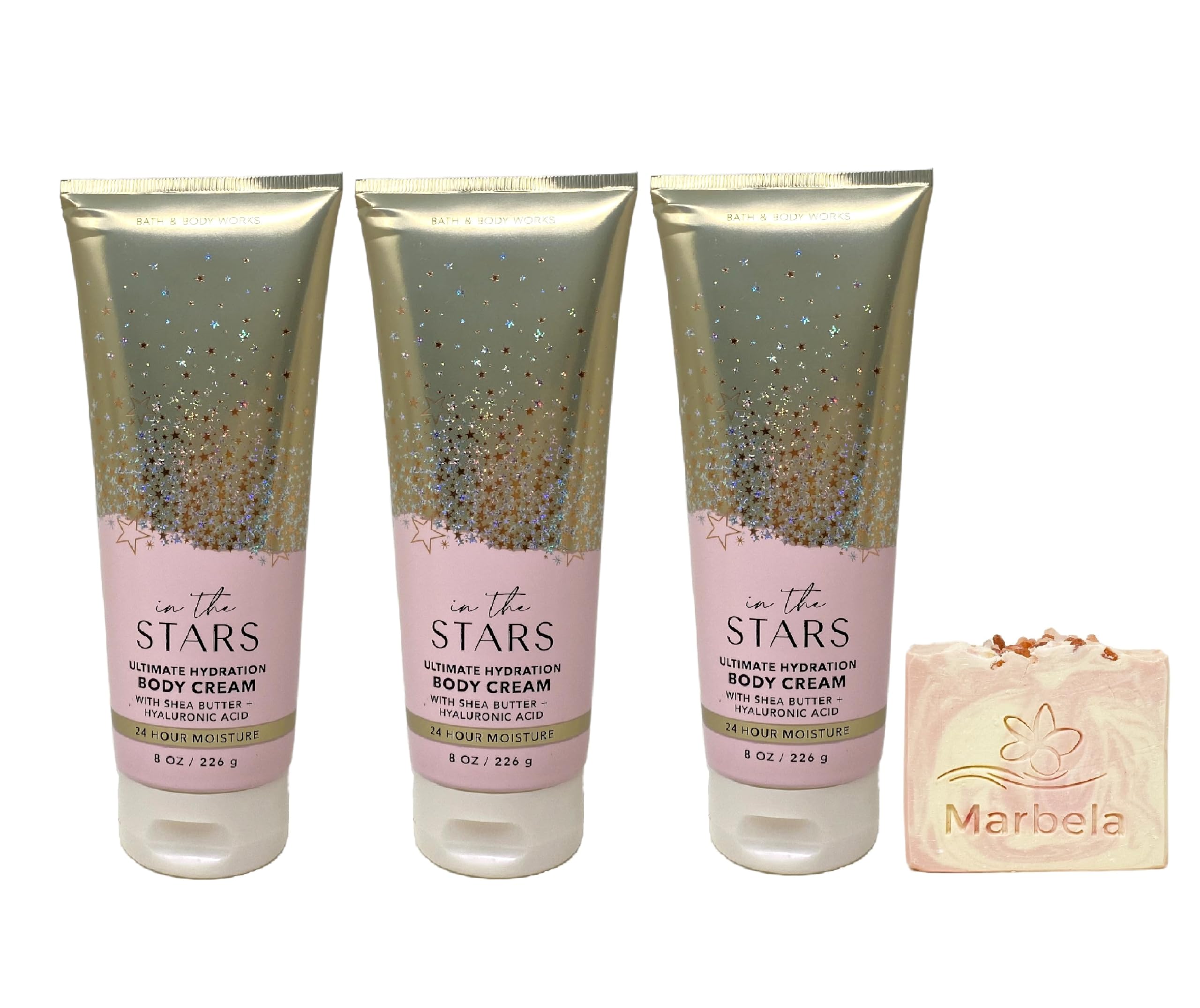 Bath Body Works In The Stars Body Cream Bundle with a Marbela Himalayan Salts Springs Bar Soap. INCLUDES: 3 Ultimate Hydration Body Creams (8 oz 226 g each) and a 4 oz Marbela Himalayan Salts Springs Bar Soap. In The Stars - What it smells like: seeing a once-in-a-lifetime comet cross a dark sky. Fragrance notes: starflower, sandalwood musk, sugared tangelo, white agarwood, radiant amber. Marbela Himalayan Salts Springs Soap - Himalayan salts help hydrate and nourish the skin, with its water absorbent properties. These minerals are known to be helpful for acne, irritated and dry skin. Himalayan Salt Springs soap has natural kaolin clay blended to further moisturize and hydrate your body. Scent: Citrusy Florals with Litsea Cubeba Essential Oil.