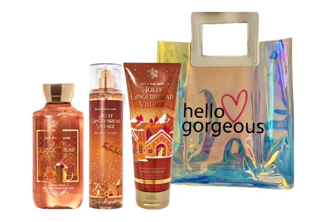 Bath & Body Works - Jolly Gingerbread Village - 3 Piece Bundle - Spray - Body Cream - Shower Gel - Full Size and Hello Gorgeous Gift Bag.