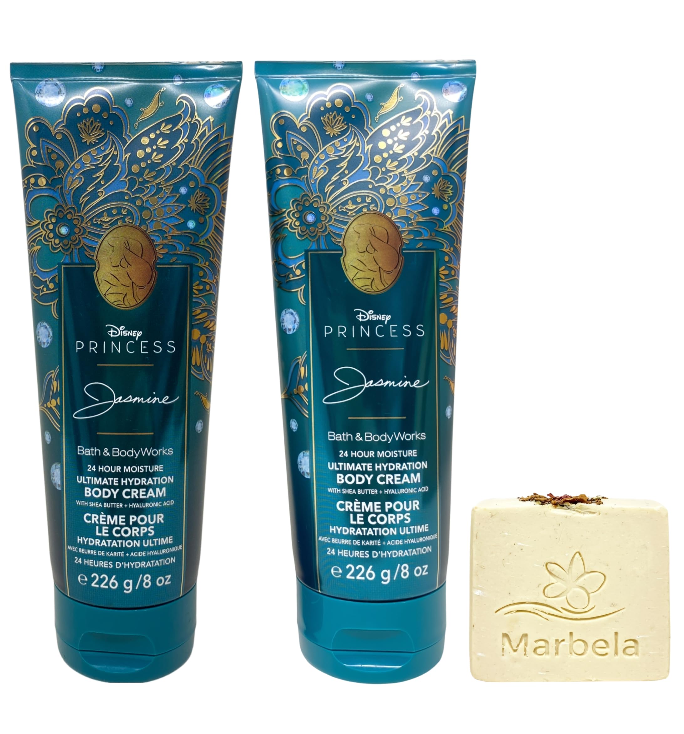 Bath Body Works Limited Edition Princess Collection Jasmine 2 Ultimate Hydration Body Creams with a Creamy Rose Bar Soap (Ingredients: Saponified Oils of: Olive Oil, Organic Virgin Coconut Oil, Shea Butter, Castor Oil, Vitamin E, Oats, Rose Petals, Mica, Fragrance, Ylang Ylang Essential Oil, Titanium Dioxide).