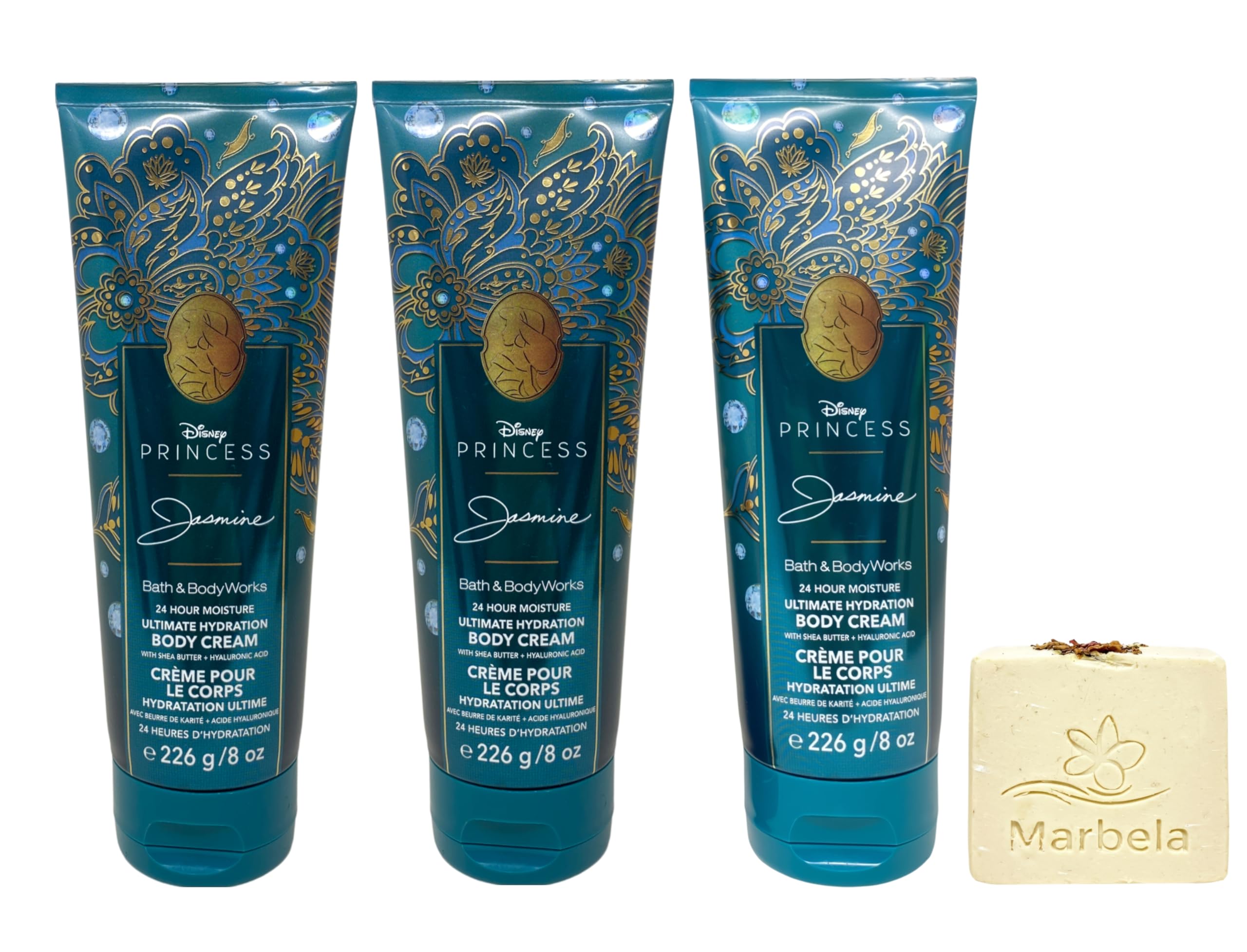Bath Body Works Limited Edition Princess Collection Jasmine 3 Ultimate Hydration Body Creams with a Creamy Rose Bar Soap (Ingredients: Saponified Oils of: Olive Oil, Organic Virgin Coconut Oil, Shea Butter, Castor Oil, Vitamin E, Oats, Rose Petals, Mica, Fragrance, Ylang Ylang Essential Oil, Titanium Dioxide).