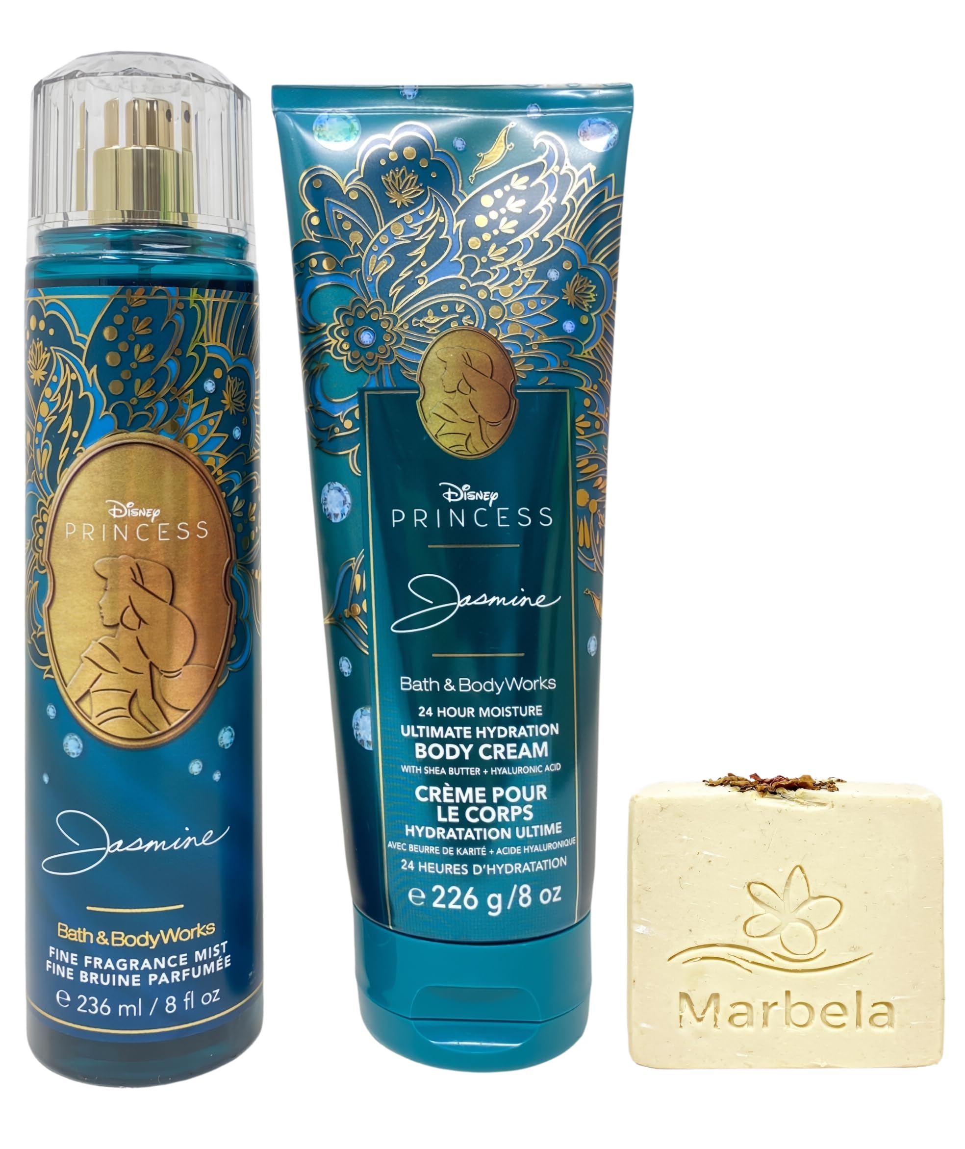 Bath Body Works Limited Edition Princess Collection Jasmine Fine Fragrance Mist and Ultimate Hydration Body Cream with a Creamy Rose Bar Soap (Ingredients: Saponified Oils of: Olive Oil, Organic Virgin Coconut Oil, Shea Butter, Castor Oil, Vitamin E, Oats, Rose Petals, Mica, Fragrance, Ylang Ylang Essential Oil, Titanium Dioxide).