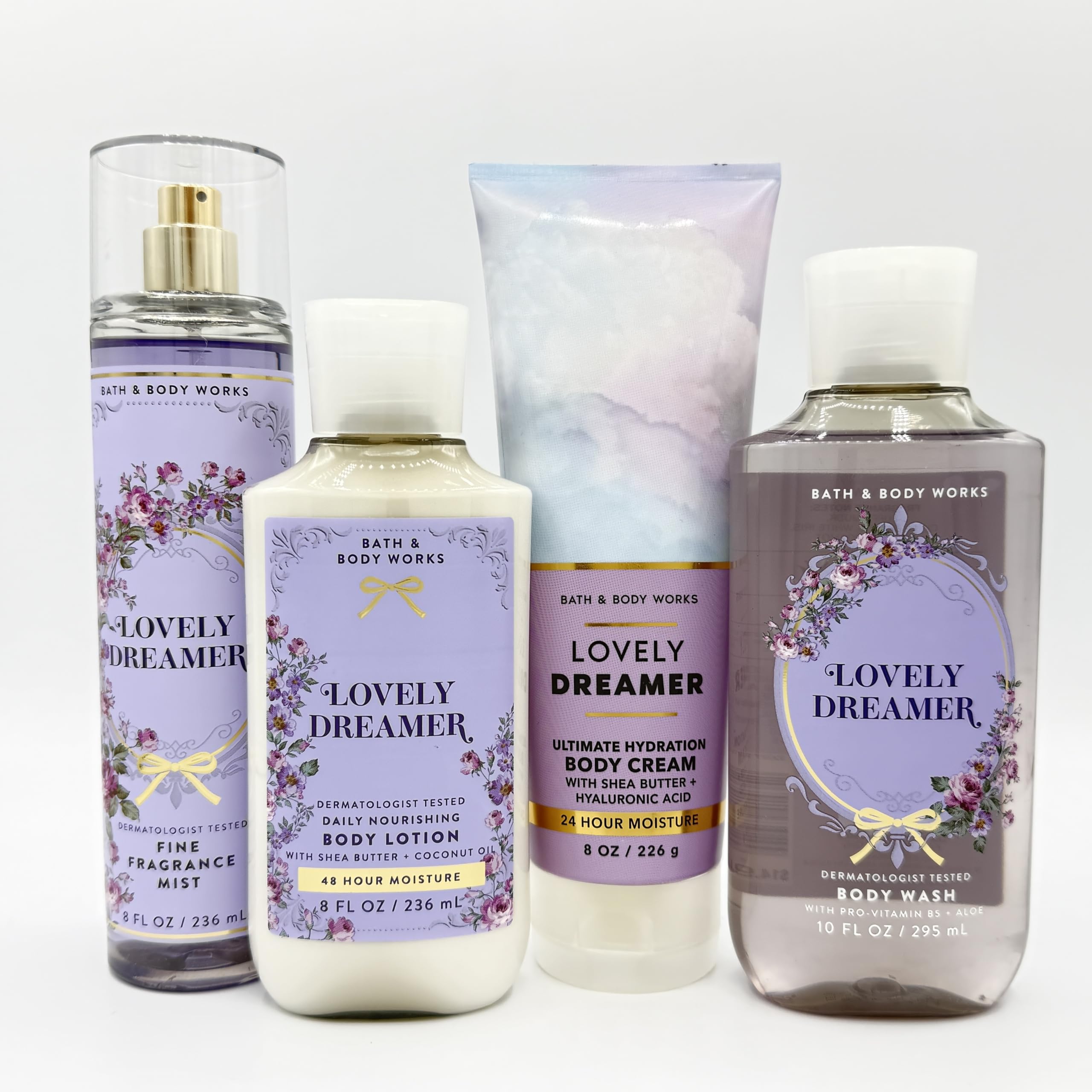 Bath Body Works Lovely Dreamer 4-Piece Set Includes: Fine Fragrance Mist, Body Lotion, Ultimate Hydration Body Cream, and Body Wash. Sizes: 8oz mist, 8oz lotion, 8oz cream, 10oz gel.