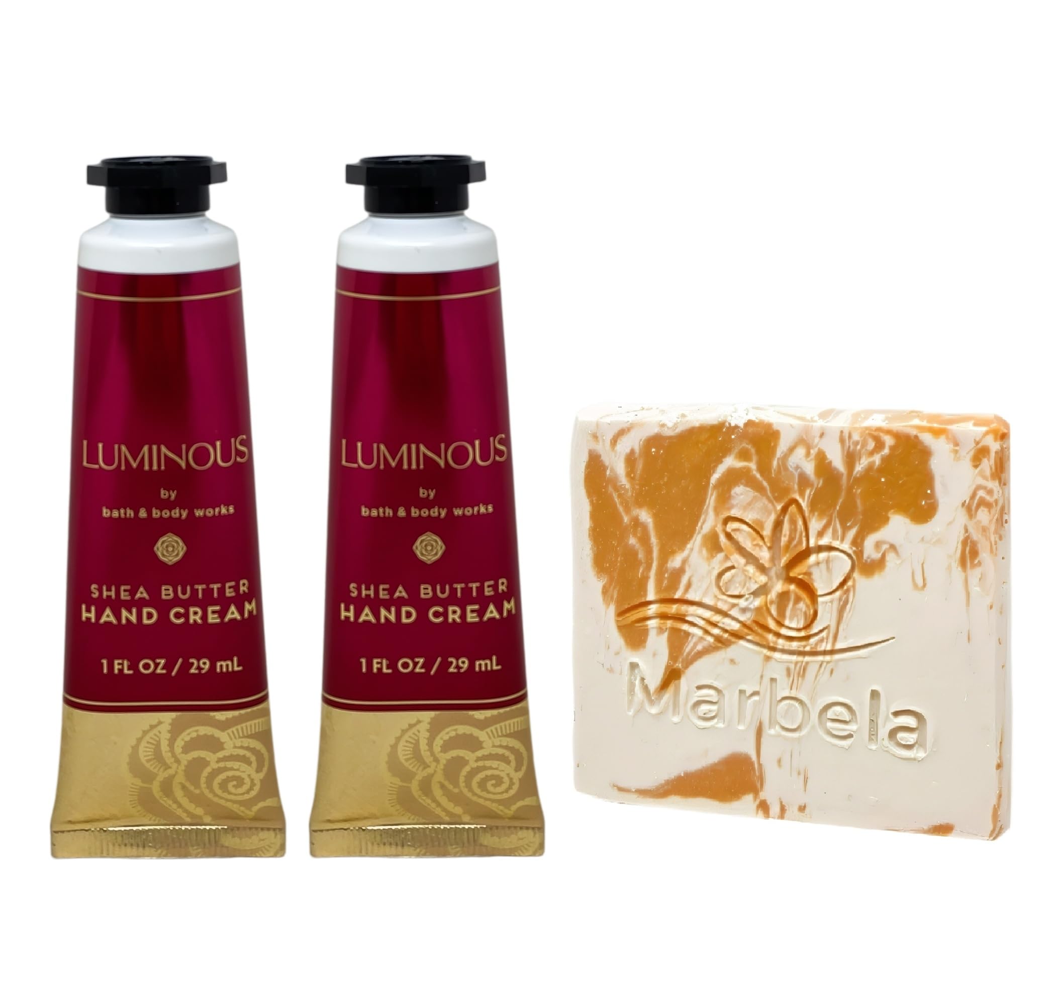 Bath Body Works Luminous - 2 Hand Cream with a Peach Gardenia Sample Soap (Soap May Vary) (Ingredients: Saponified Oils of: Olive Oil, Organic Virgin Coconut Oil, Shea Butter, Castor Oil, Fragrance, Mica, Vitamin E)