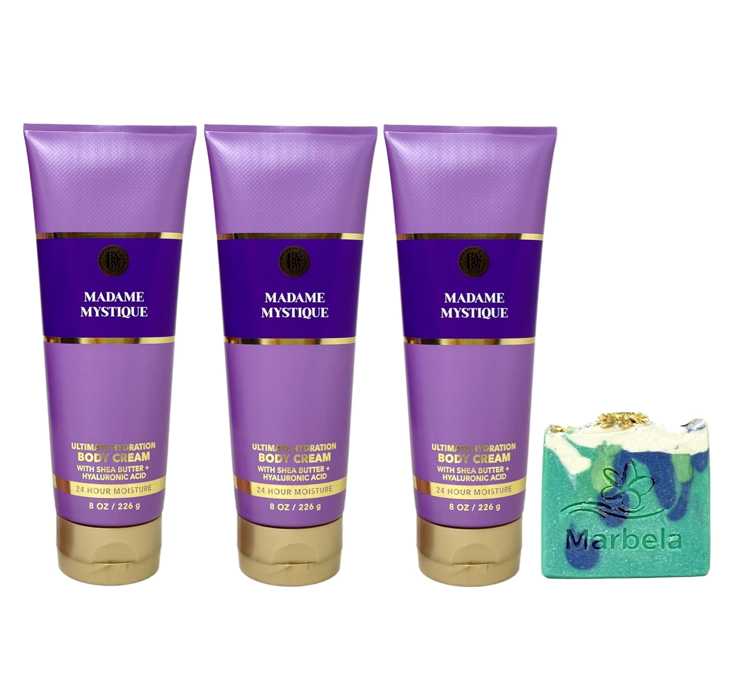 Marbela Aloe Vera Bar Soap - If your skin has been craving moisture, this soap is for you. It's hard to find time to treat your skin with extra care. Adding aloe vera soap to your routine is an easy way to add a new level of care for your body because of aloe vera's natural benefits. Madame Mystique - What it smells like: a whirlwind romance full of intrigue and desire. Fragrance notes: bright red berries, rose petals and sultry woods. 3 Ultimate Hydration Body Creams (8 oz 226 g each) - What it does: provides intense hydration to relieve dry skin for 24-hour moisture. Bath Body Works Madame Mystique Body Cream Bundle with a 4 oz Marbela Aloe Vera Bar Soap (Soap May Vary).