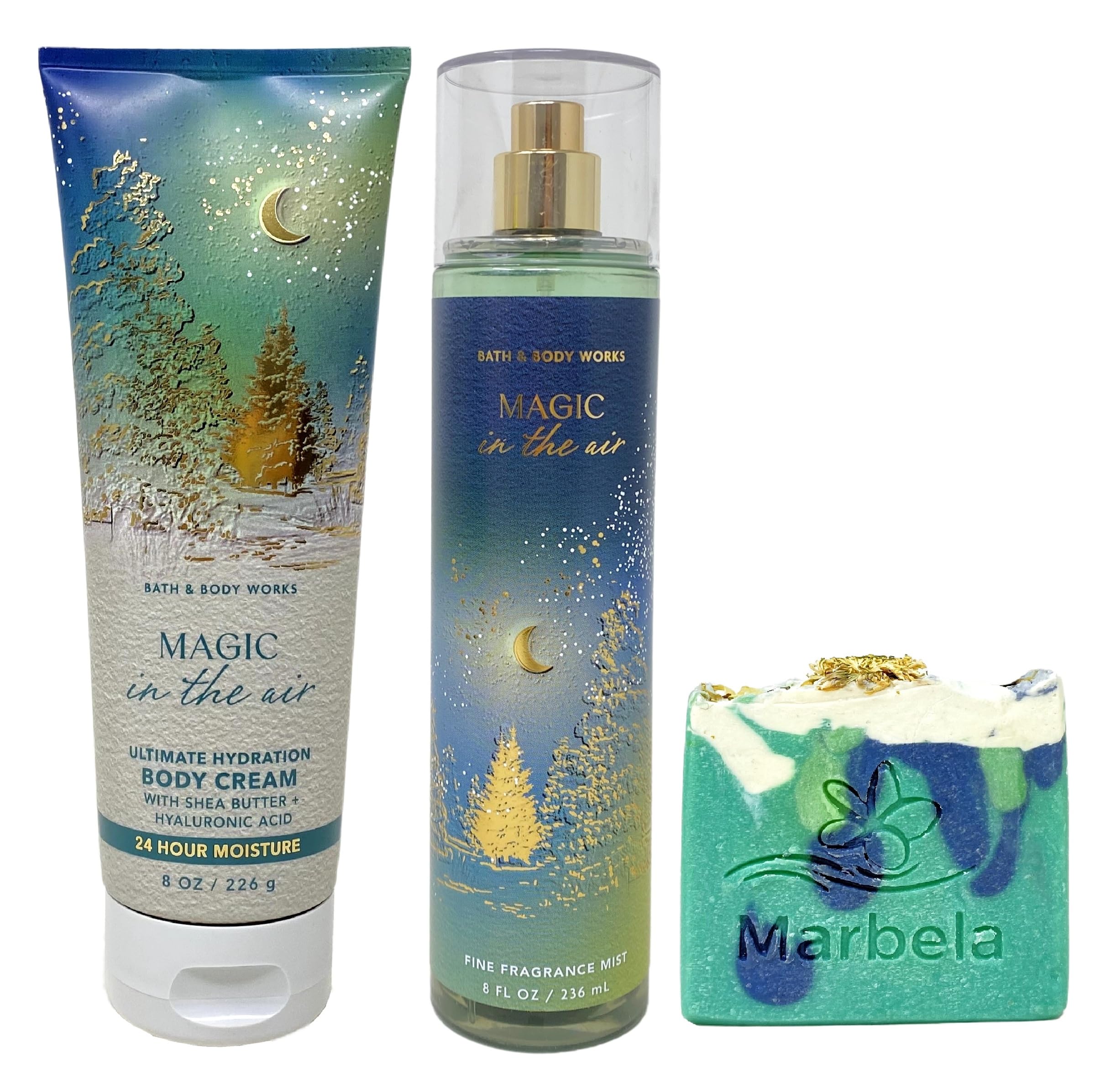 Bath Body Works Magic In The Air Duo Gift Set - Body Cream and Fragrance Mist with a 4 oz Marbela Aloe Vera Bar Soap (Ingredients: Saponified oils of: Olive Oil, Organic Virgin Coconut Oil, Shea Butter, Castor Oil, Aloe Vera, Fragrance, Vitamin E, Mica, Sweet Almond Oil).