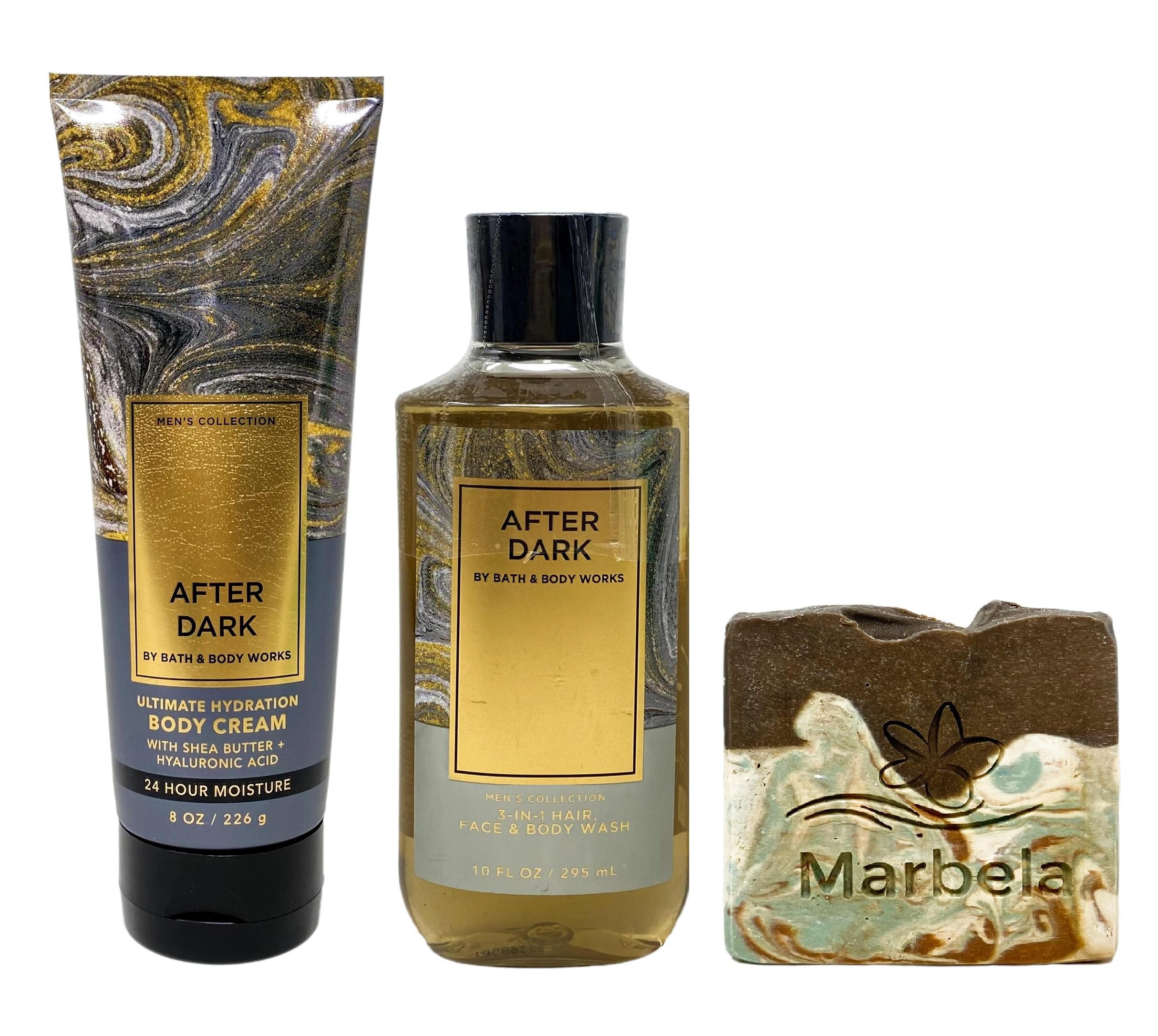Marbela Cabin Spice Soap - Imagine being cozied up next to a bonfire, cooking over the fire, and smelling the smoke all through the air. There are few things that feel quite like fall in the same way a bonfire does. Cabin Spice is the perfect warm scent to last from early fall all the way through the winter. Scent: Tobacco, Patchouli, Bay. After Dark - What it smells like: the citrusy, warm, velvety accessory your night-out wardrobe needs. Fragrance notes: spiced bergamot, amber and smooth tonka. INCLUDES: 8 oz 226 g Ultimate Hydration Body Cream, 10 fl oz 295 mL 3-in-1 Hair, Face Body Wash, and a 4 oz Marbela Cabin Spice Bar Soap. Bath Body Works Men's Collection After Dark Duo Bundle with a Marbela Cabin Spice Bar Soap.