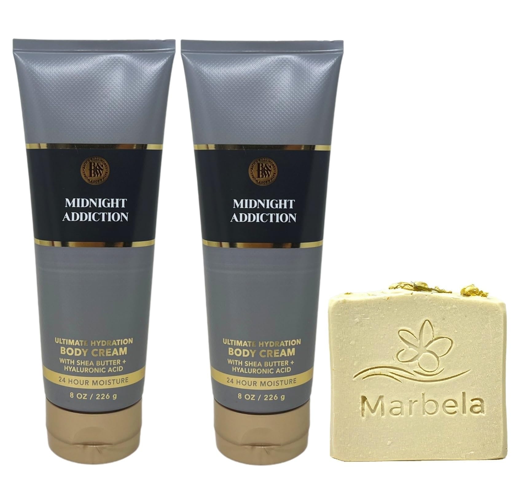 Midnight Addiction: What it smells like: an edgy, seductive vibe you can't stay away from. Fragrance notes: ripe plum, rich almond flower and addictive coffee bean. Marbela Wild Jasmine Bar Soap: Imagine looking out over a horizon full of fresh wildflowers while you are holding a warm mug of tea.Wild Jasmine soap accomplishes this same feeling of warmth and peace while being a universally attractive scent. Handmade, Vegan Friendly, Cruelty Free. 2 Ultimate Hydration Body Cream (8 oz 226 g Each ) What it does: provides intense hydration to relieve dry skin now moisturizing for up to 48 hours.Infused with the good stuff (natural essential oils, vitamin E, aloe, shea butter, cocoa butter and hyaluronic acid). Bath Body Works Midnight Addiction Ultimate Hydration Body Cream 2 Pack with a Wild Jasmine Bar Soap.